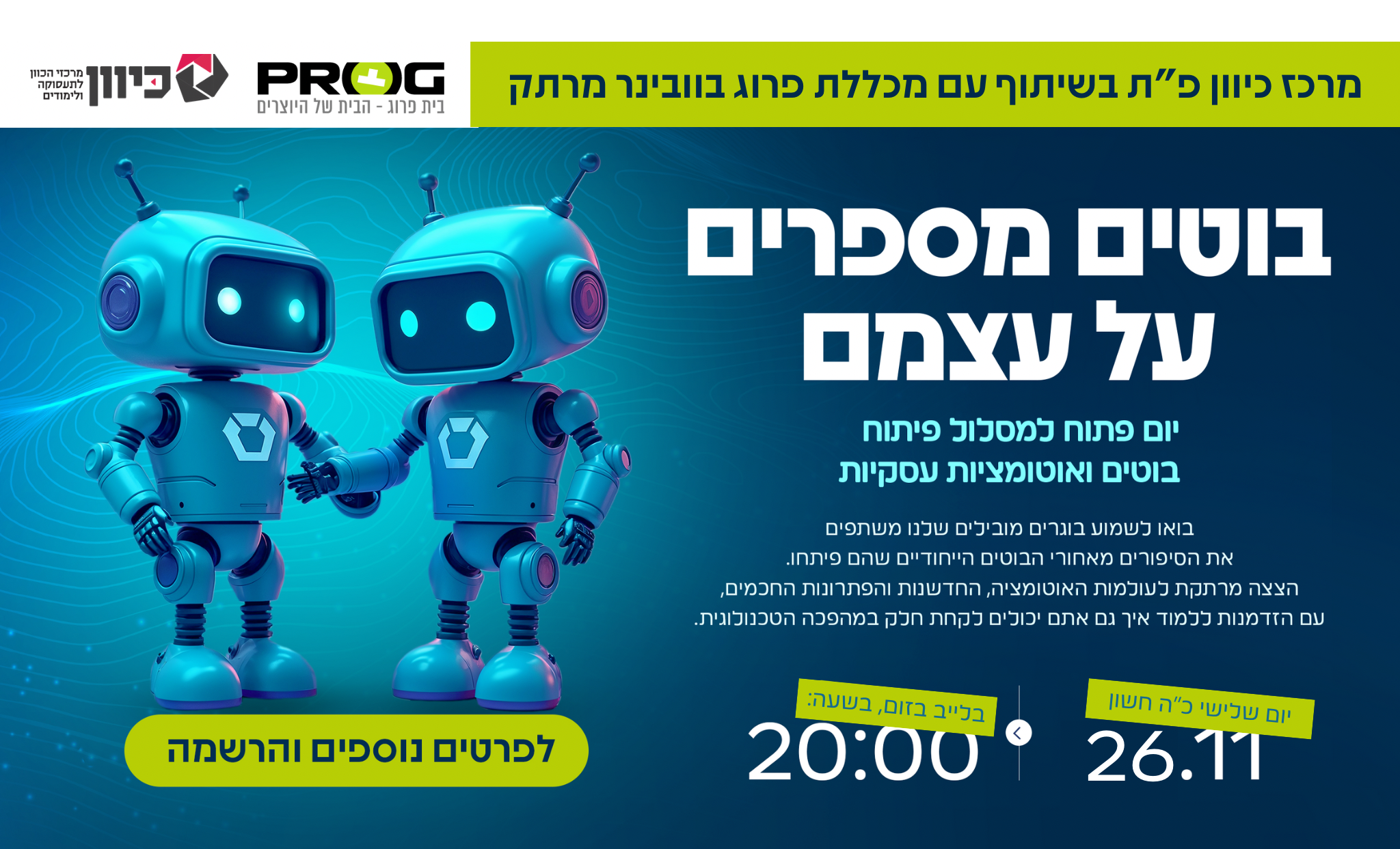 אנחנו מזמינים אתכם לוובינר מיוחד בהשתתפות של בוגרי מסלול קורס פיתוח בוטים ואוטומציות עסקיות, שיציגו את הבוטים הייחודיים שבנו, בואו לשמוע על עולם האוטומציות והבוטים מזווית אחרת ומרתקת, הצצה ייחודית לעולמות האוטומציה והפתרונות החכמים, עם הזדמנות ללמוד כיצד אתם, יכולים לקחת חלק במהפכה הטכנולוגית.