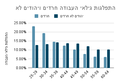 הציבור החרדי כידוע, גודל דמוגרפית בקצב מהיר בהשוואה לציבור הלא חרדי, וממילא זה גורם שבין גיל 25 לגיל 34 יש 42.6% מהחרדים שהם בגילאי העבודה, ולעומת זה בין גיל 55 לגיל 64 הם רק 12.4%.
