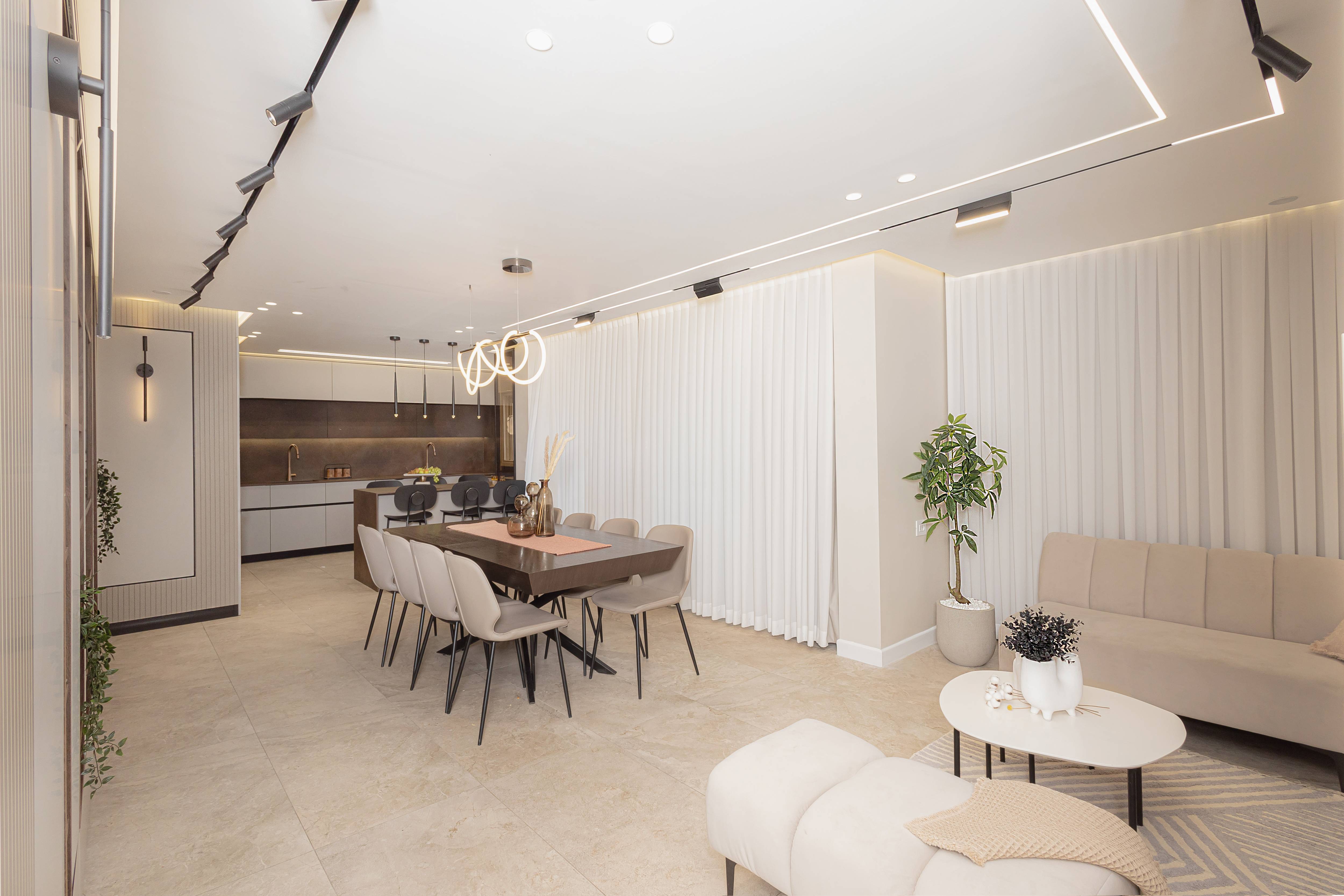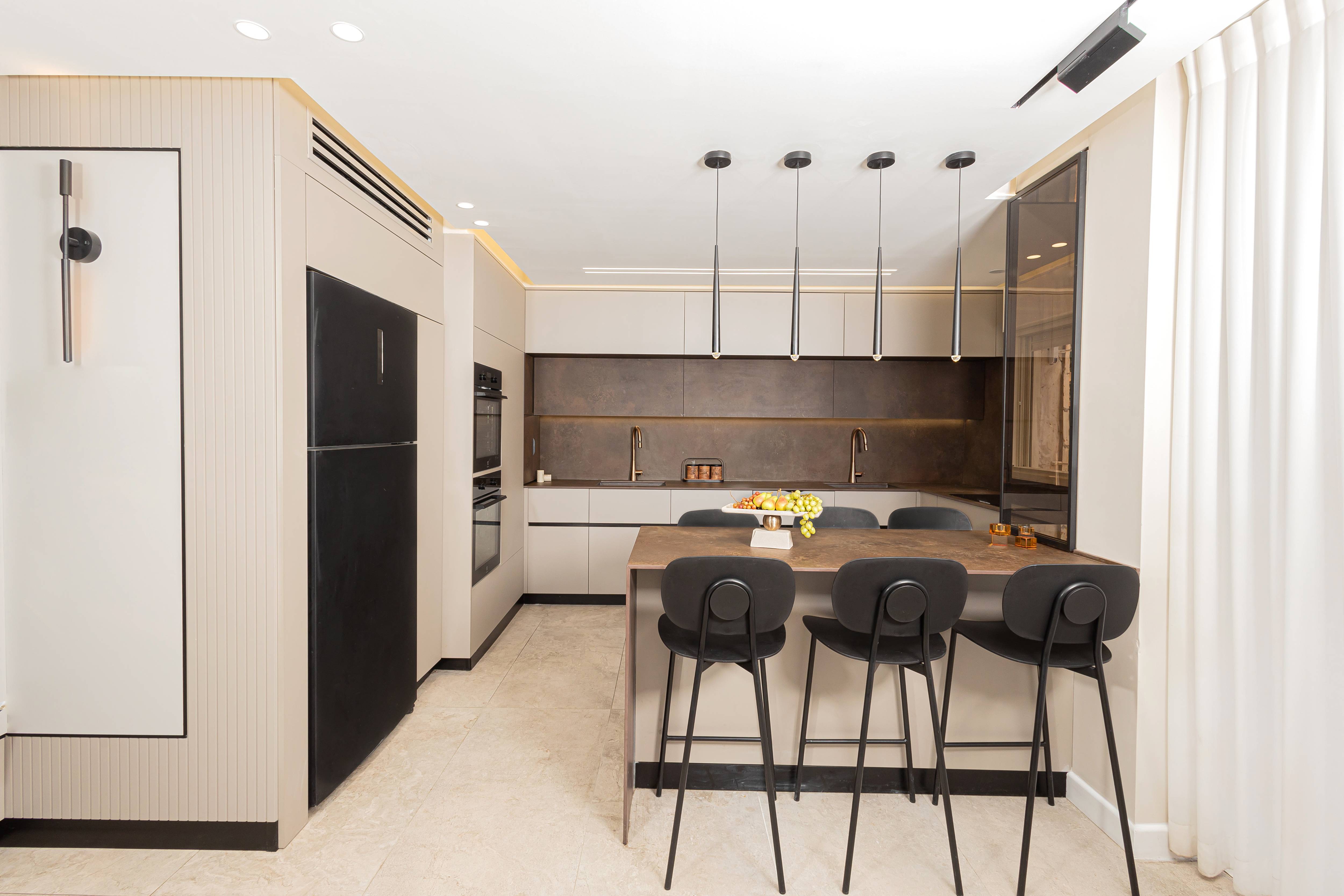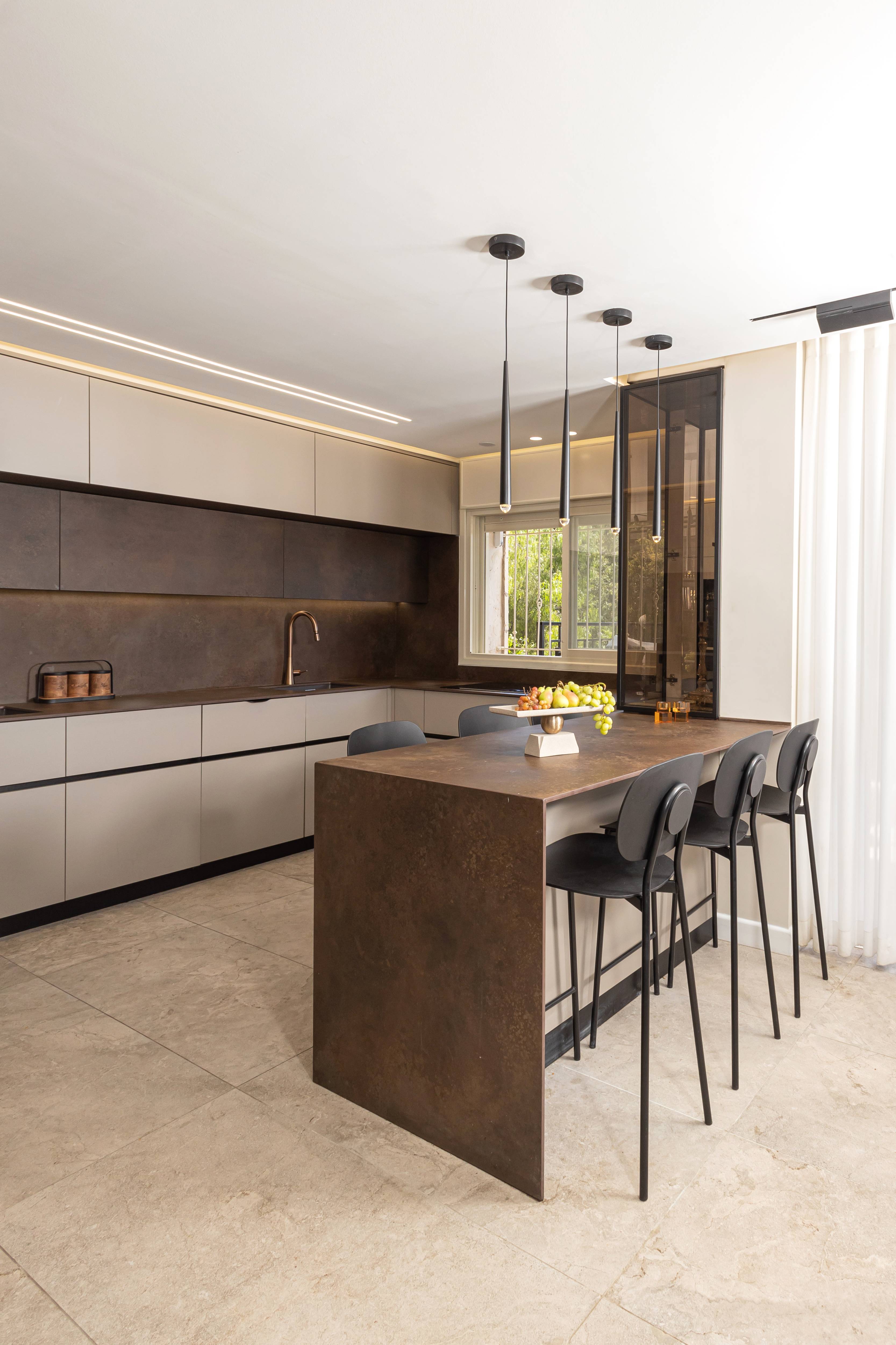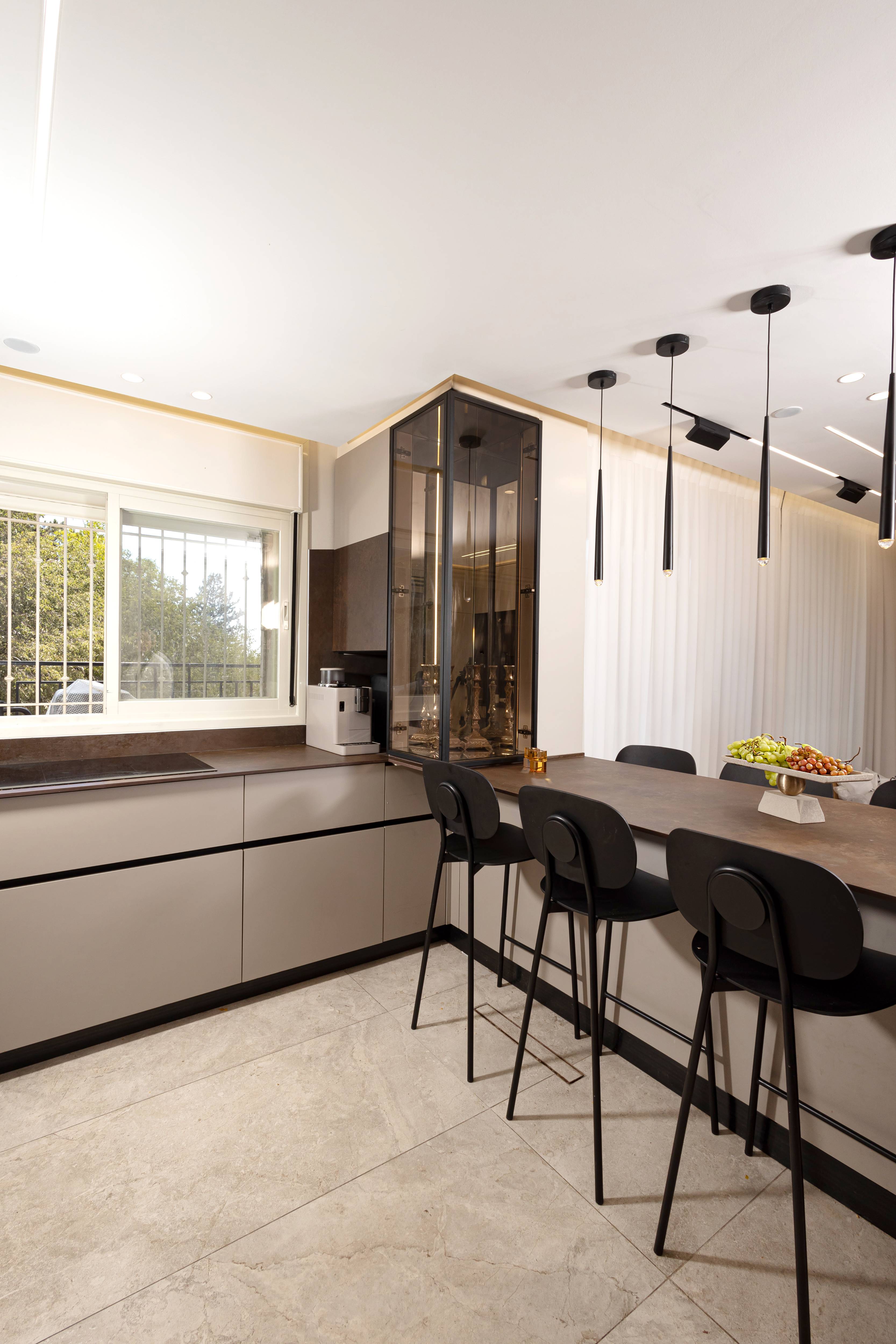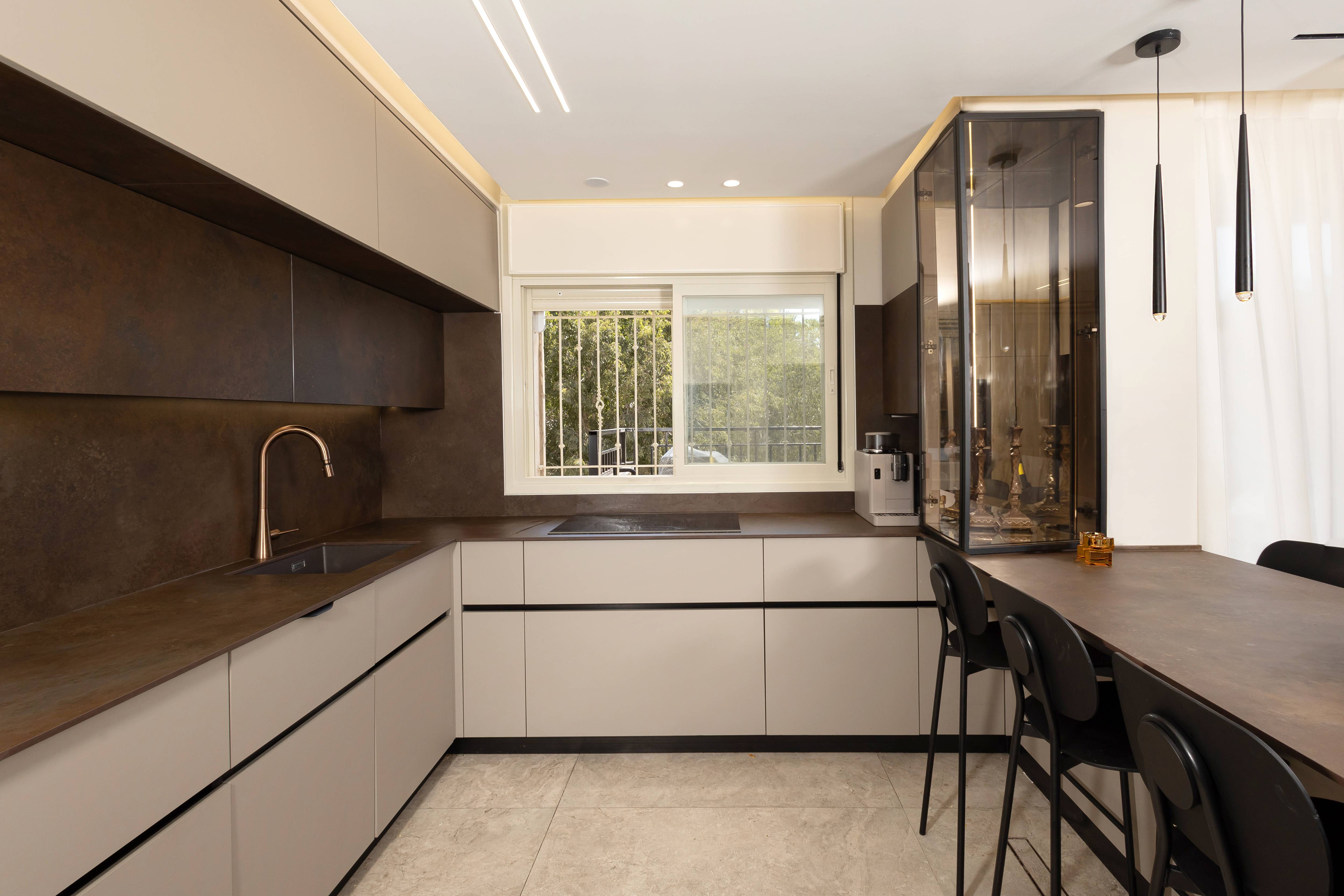 • במטבח: הארונות העליונים חופו בגרניט פורצלן דק, כהמשך ישיר למשטח השיש – ליצירת מראה אחיד ויוקרתי.