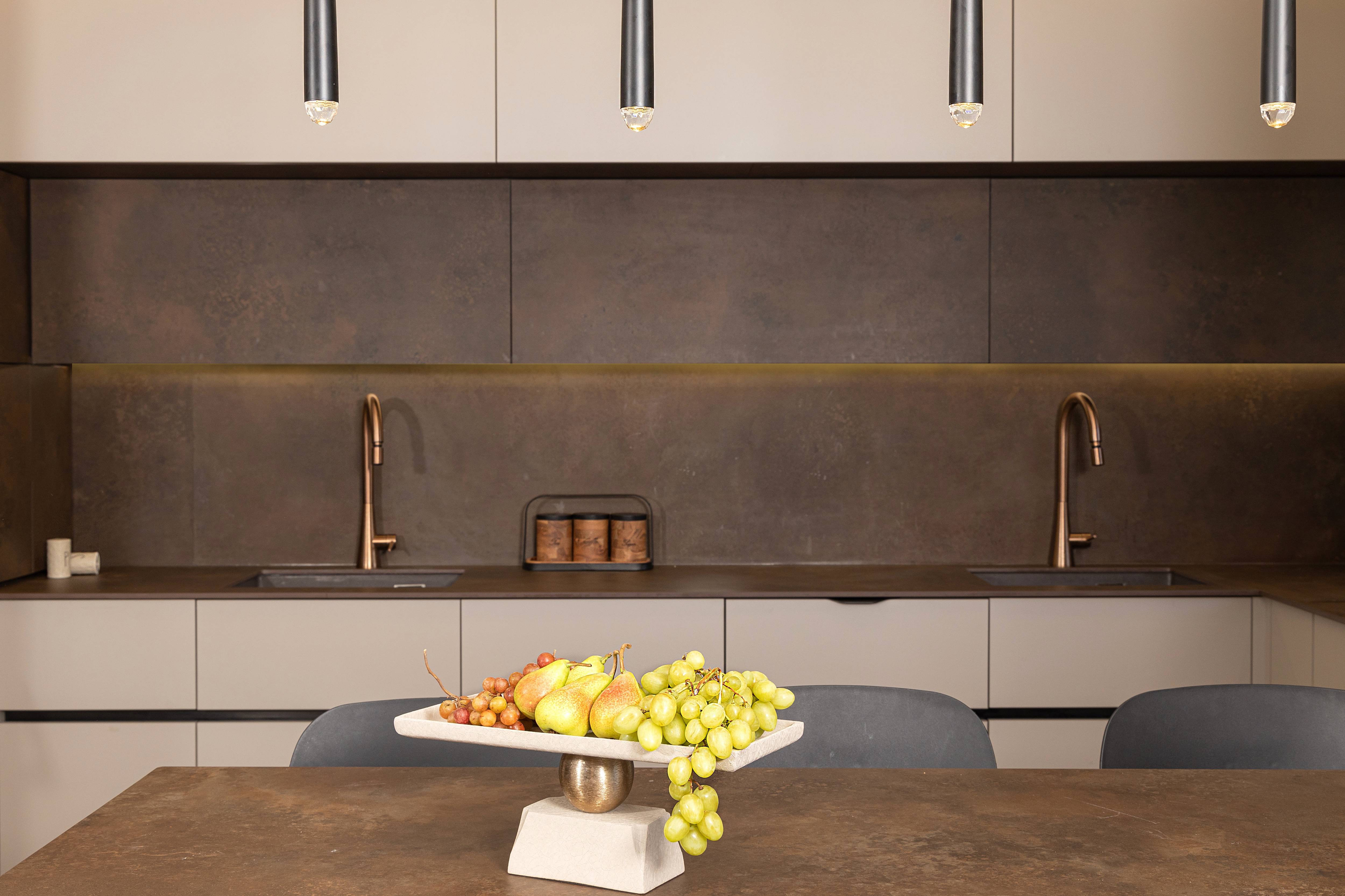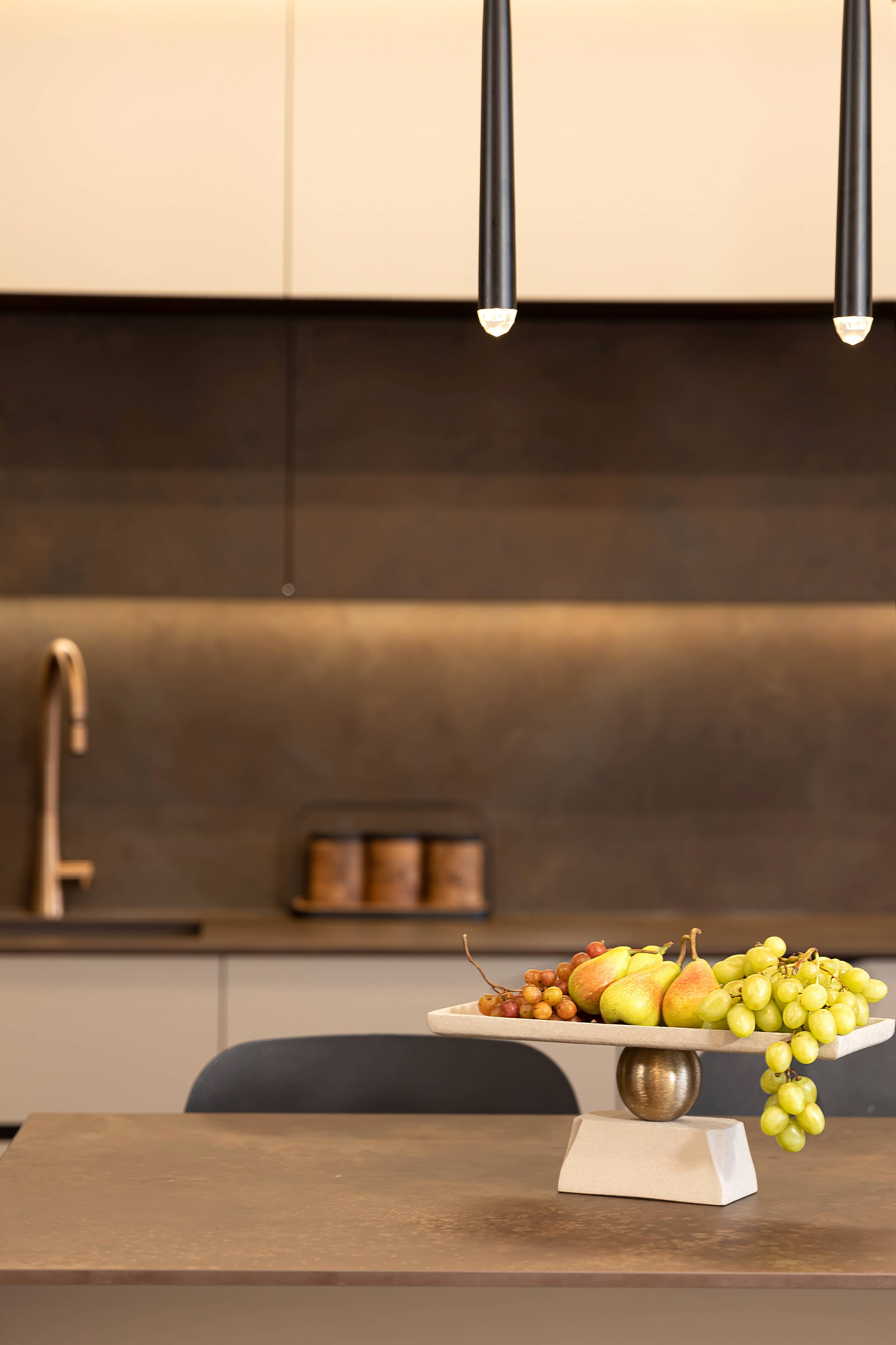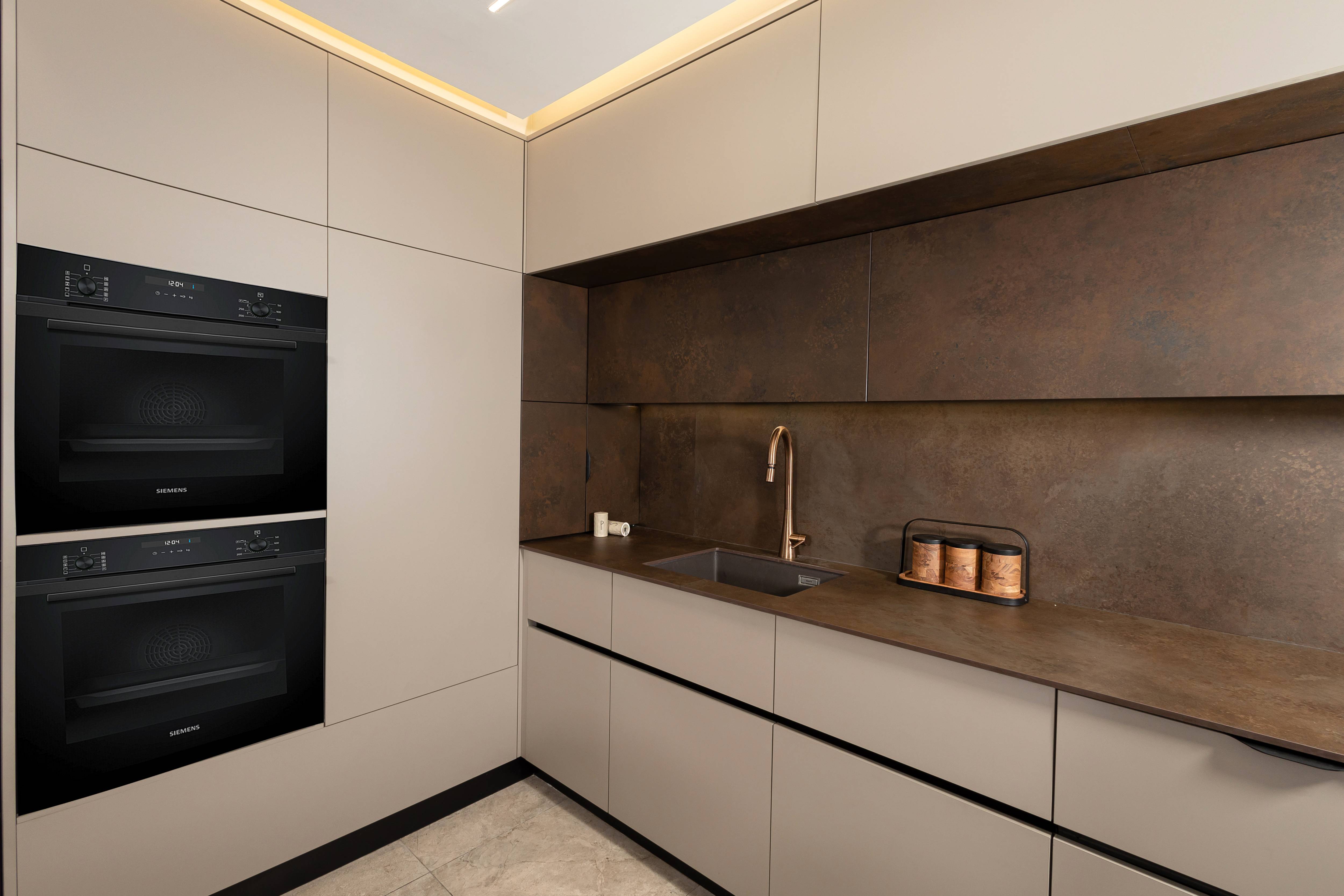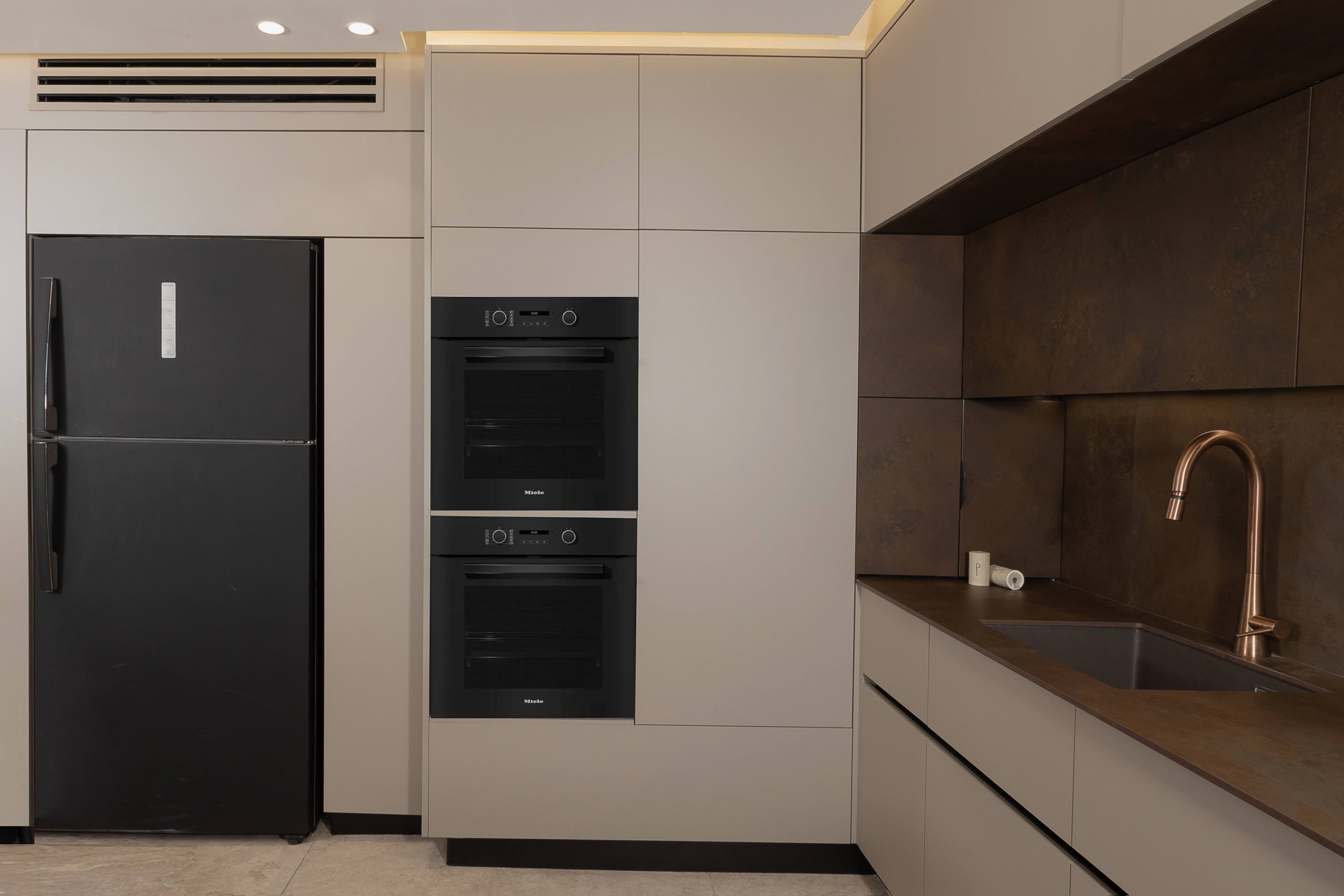 מבחינה עיצובית, חלמנו ליצור מראה של “קופסאות צבע אחיד”. את הרעיון יישמנו באמצעות חיפוי גרניט פורצלן בארונות העליונים כהמשך ישיר לשיש, והתוצאה – מראה נקי, יוקרתי והרמוני.