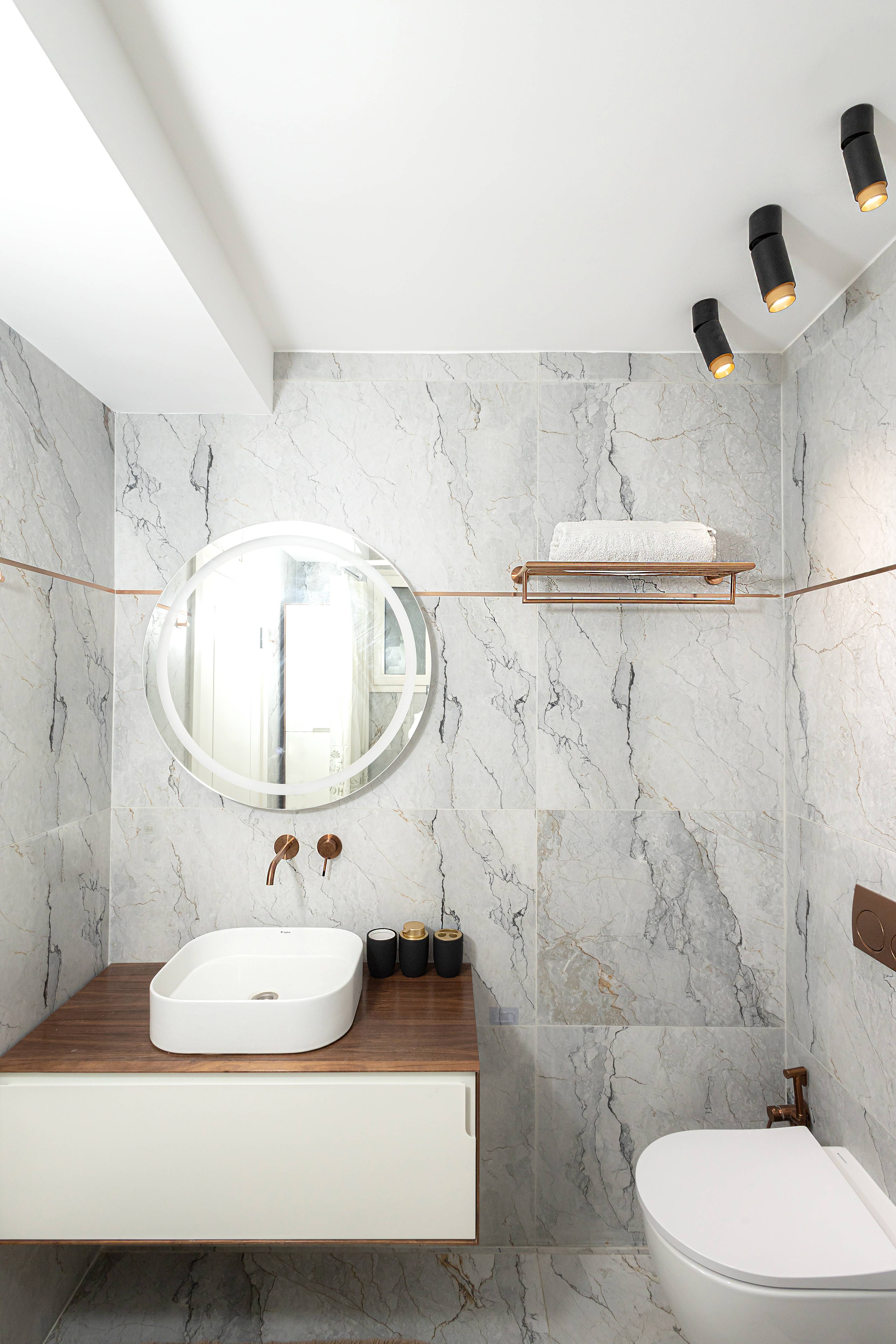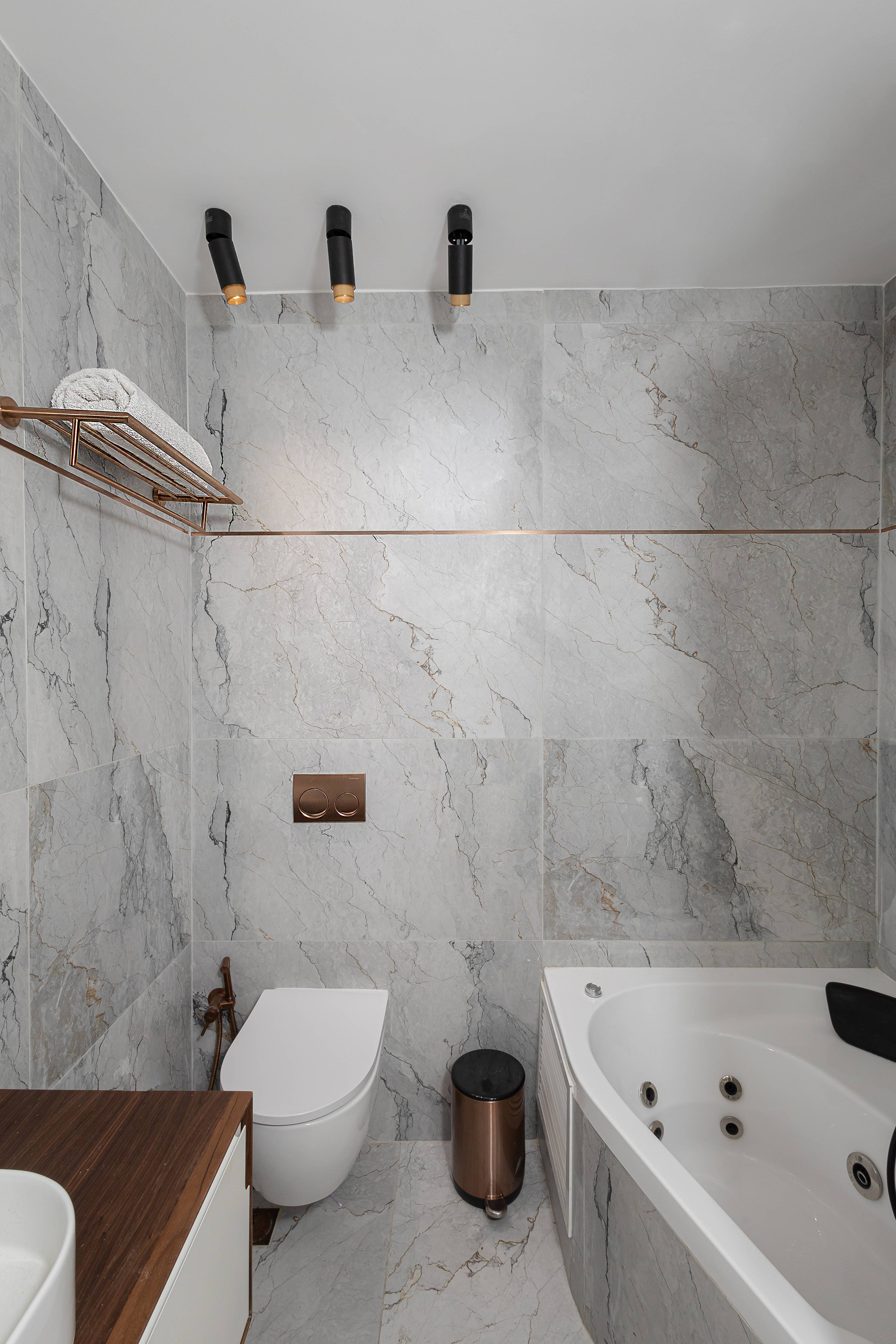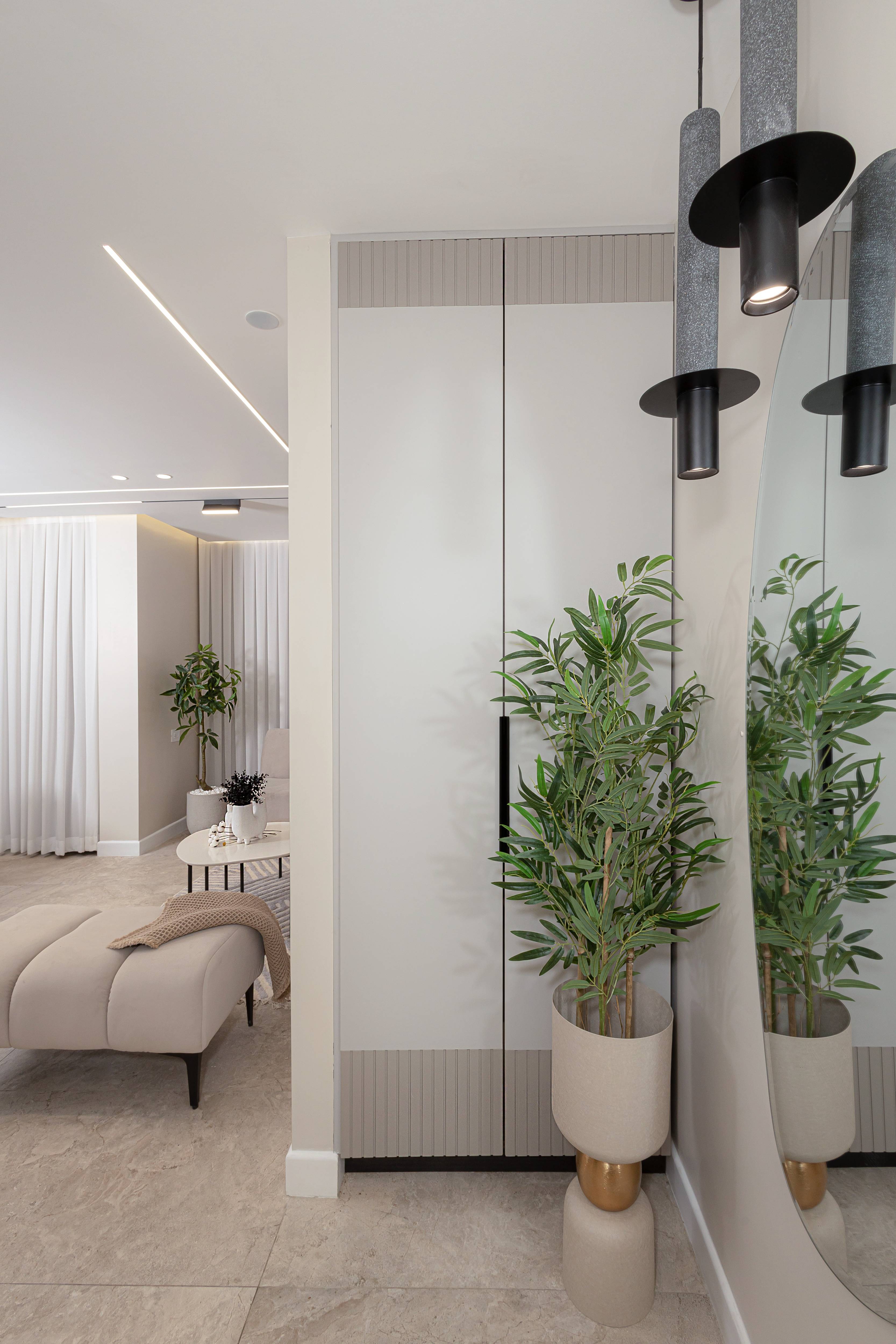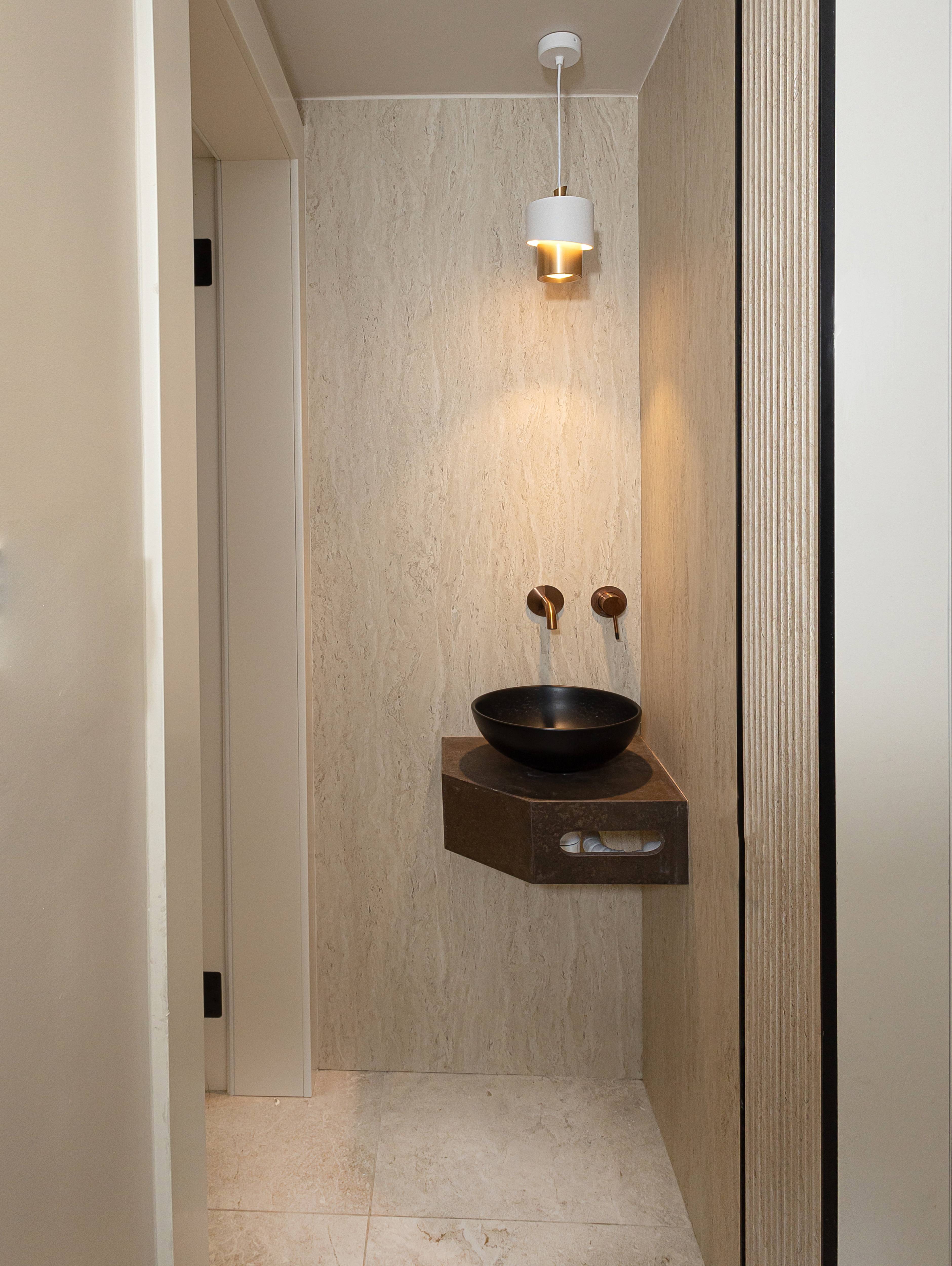 הפרויקט כולו מתאפיין בבחירת חומרים לא סטנדרטיים ומלאי אופי, ביניהם גם פינת נט״י מיוחדת שבוצעה בפולימר דמוי טרוורטין – פתרון חכם וחדשני ששילב יופי עם פרקטיות.
