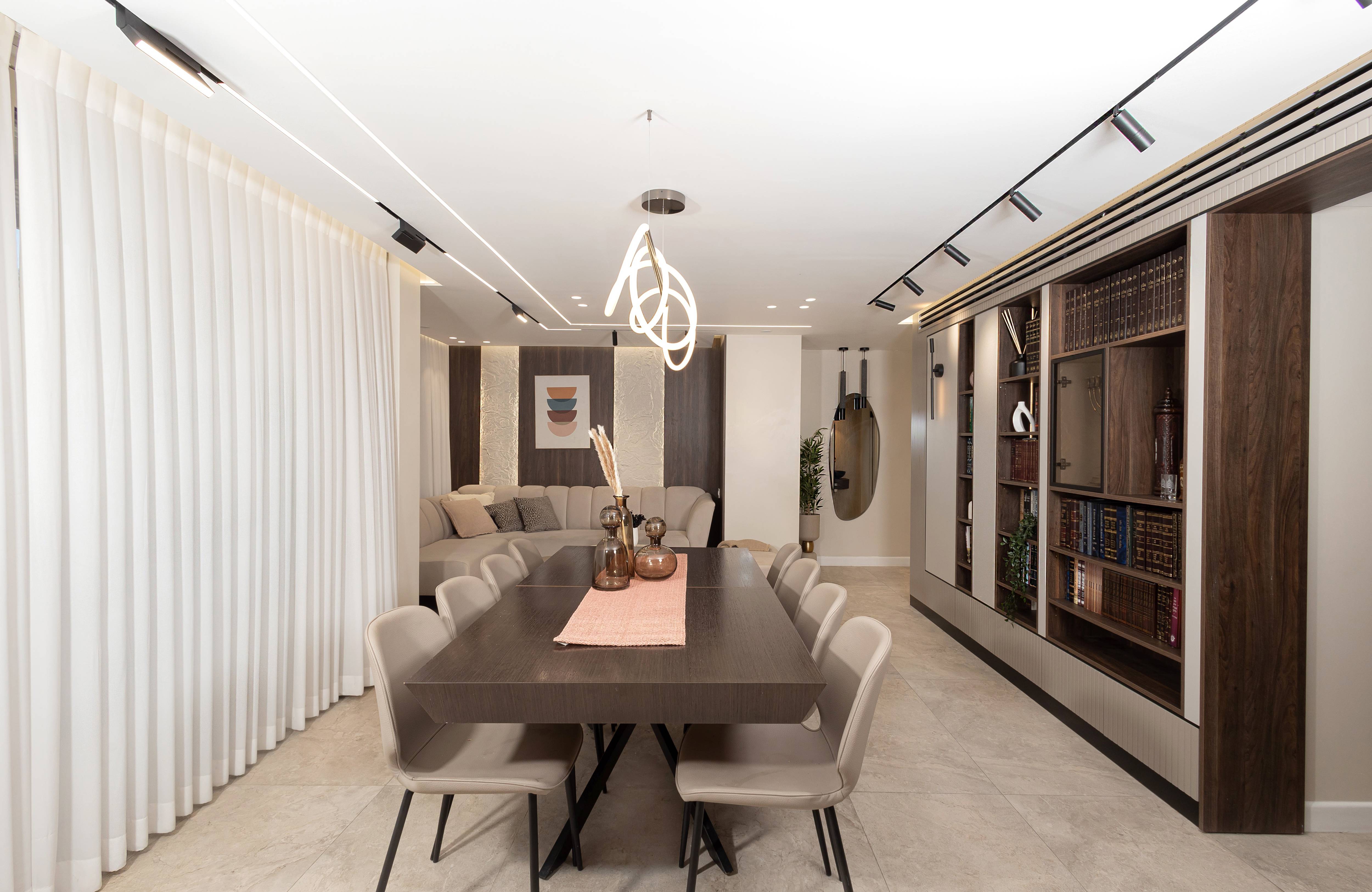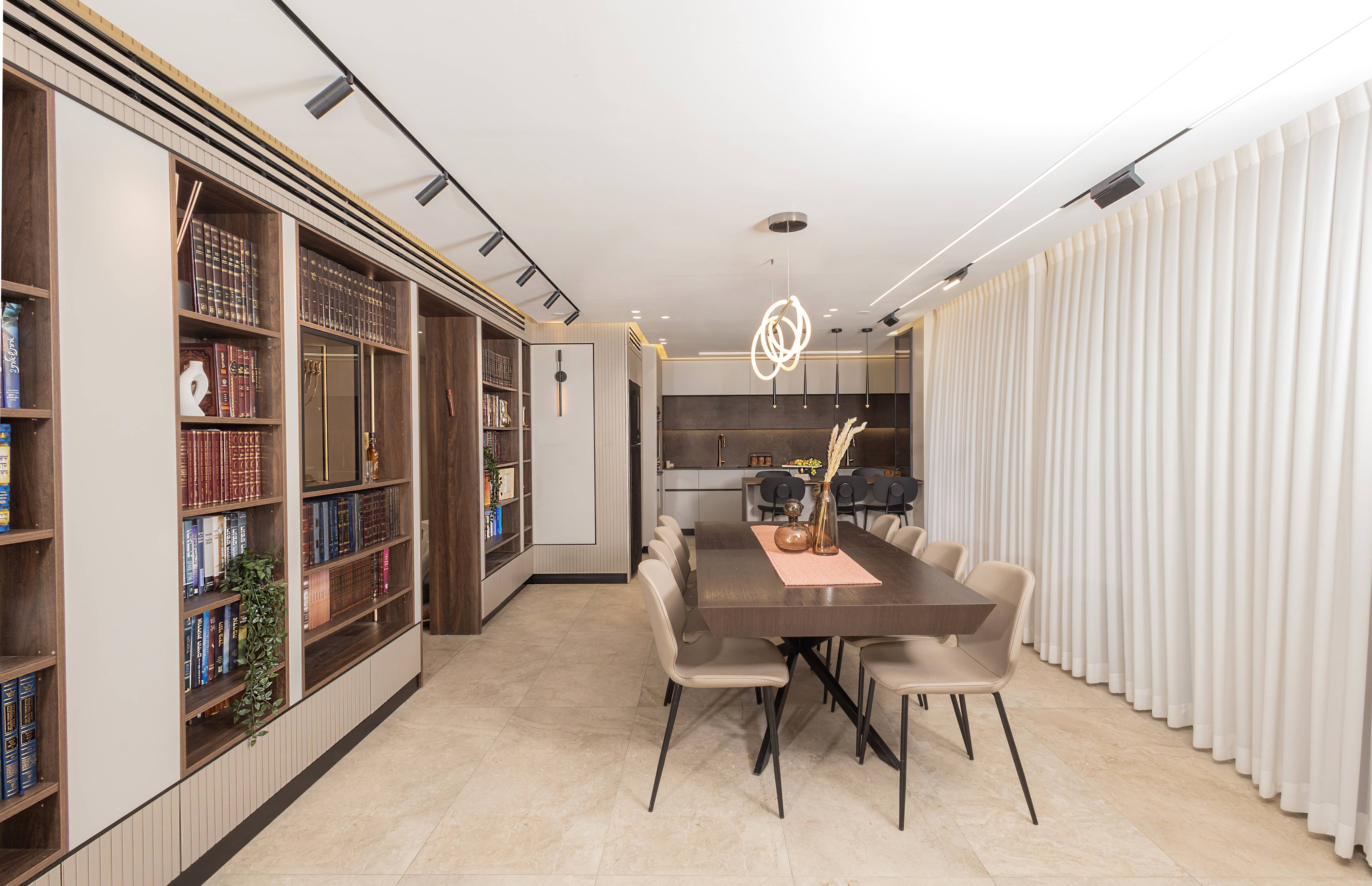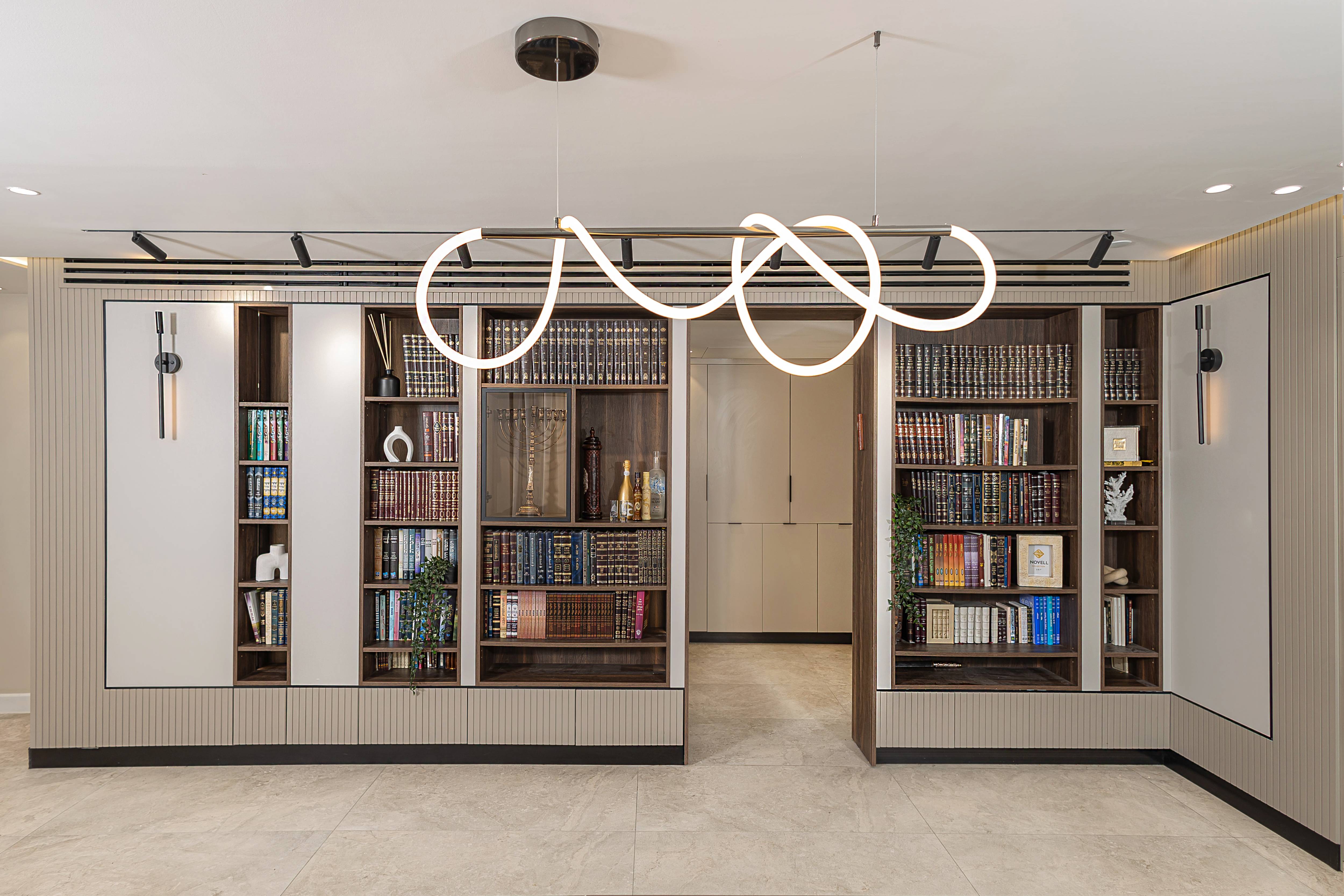 • בספרייה: שילבנו עץ טבעי עם חירוץ עדין בגוון שמפניה, שהוסיף עניין וטקסטורה.