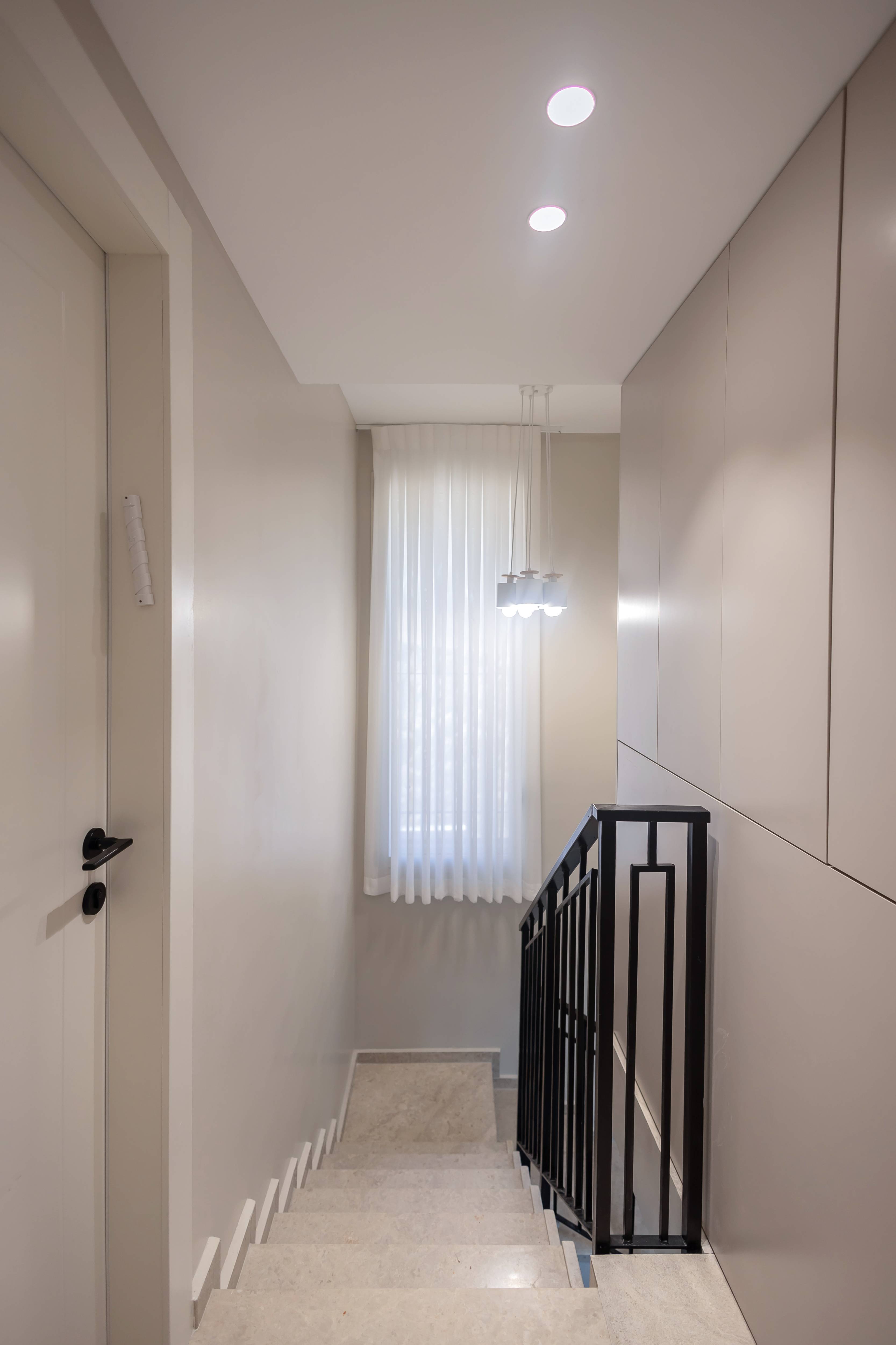 ומההיבט הפרקטי – המזווה נבנה על גבי מדרגת בטון מוסתרת, שהיא למעשה תקרת גרם המדרגות שמתחת, פתרון חכם שניצל את השטח בצורה מקסימלית.