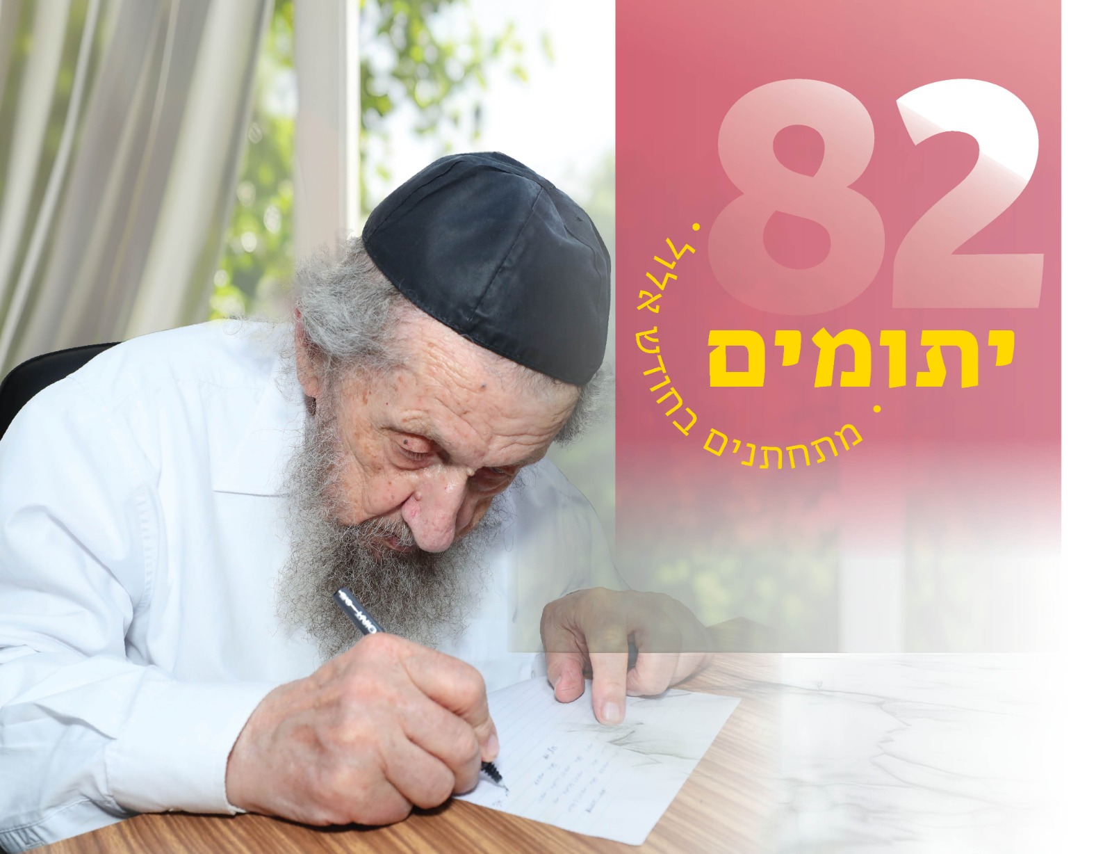 בתמונה: רבן של ישראל מרן רבינו ראש הישיבה רבי דוב לנדו שליט"א חותם על מכתב הקריאה82 יתומים ויתומות מתחתנים במהלך חודש אלול