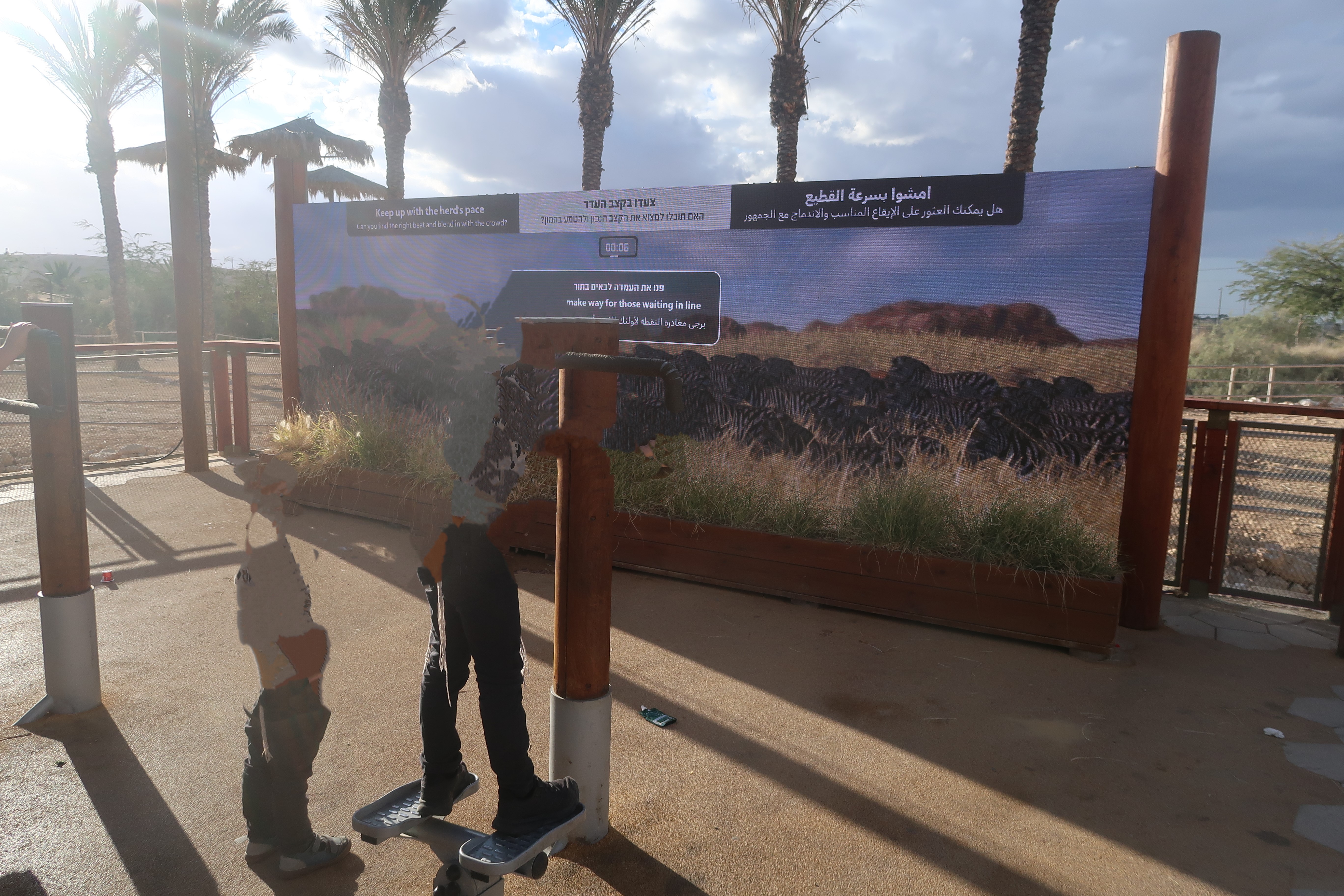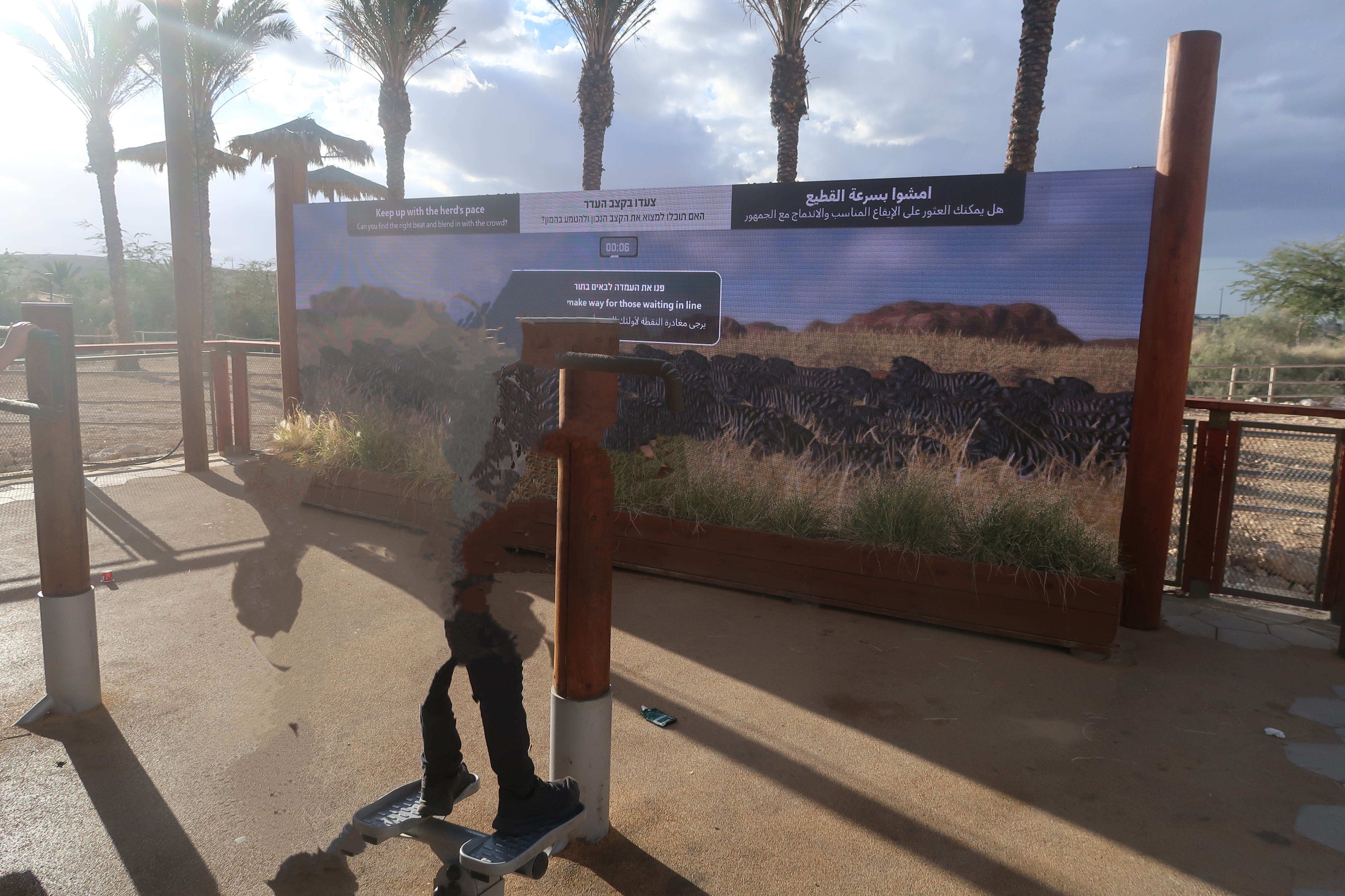 ליד הזברות יש מסך גדול עם דמוית זברה שהולכות בעדר, וליד המסך יש אופני כושר שהילדים עולים עליהם ומדוושים ולכל ילד יש זברה 'אישית' על המסך והוא צריך להריץ אותה בקצב של העדר,