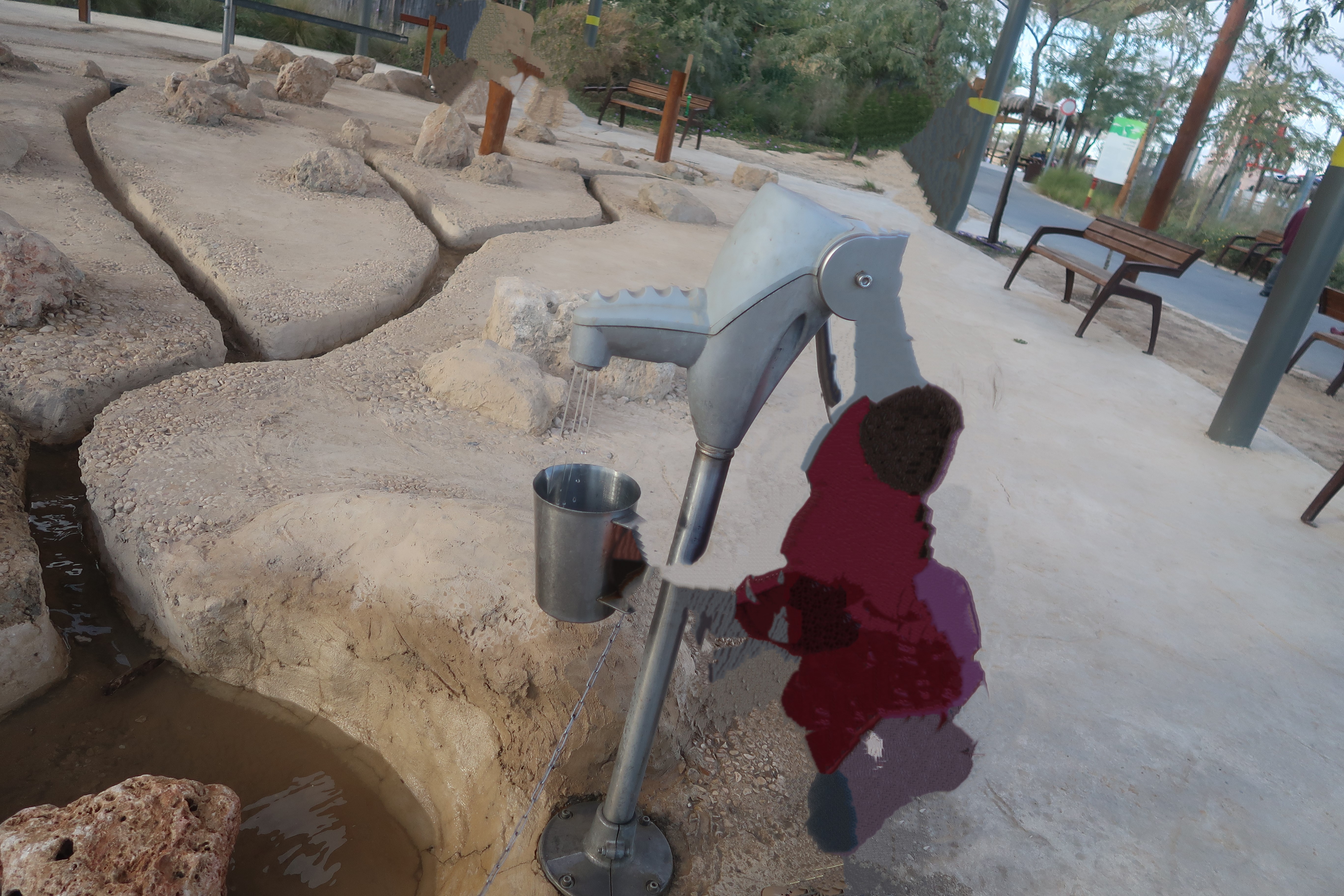 יש מתחם למידה על הגשם ועל אדמת המדבר- הילדים מפעילים משאבות מים, וברצפה פותחים "סכרים" ו''ערוצי נחל'' ונהיה שיטפון...