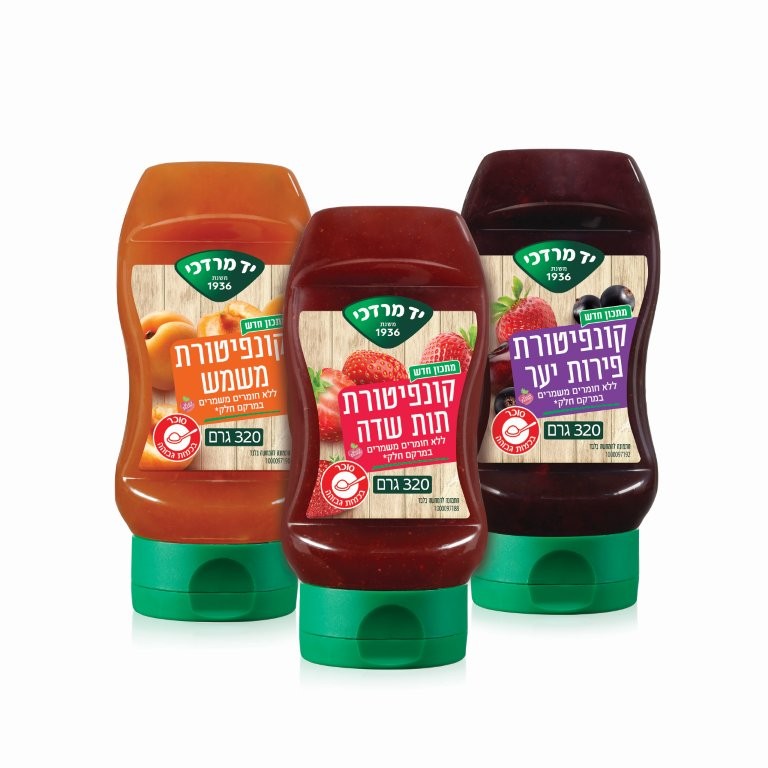 יד מרדכי, המותג הישראלי האהוב, משיק סדרת קונפיטורות בבקבוקים לחיצים, לשימוש נוח, מדויק ואסתטי. הסדרה כוללת שלושה טעמים פופולריים: תות שדה, משמש ופירות יער.