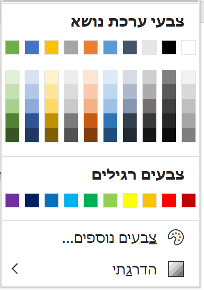 צבעי ערכת הנושא הסטנדרטית ב-Word. מבטיחה שימוש בצבעים סולדיים יחסית ברוב המסמכים, אבל גם מאפשרת ללקוח לבחור צבעים אחרים.
