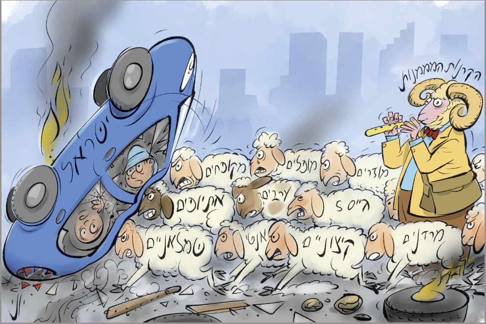 "אחרי שקראתי בחדשות שהקרן החדשה ממנה את ההפגנות המסעירות שסתמו את המדינה החלטתי לנסות להעביר את המסר בקריקטורה". פותח יוני. "חיפשתי איזו דרך להראות תחפושת, מעין אתיופי שמולבש על רשעים. אולי חציו הקדמי אתיופי, חציו האחורי אירופאי שמאלני... ולא הסתדר. חשבתי על משל של חיות- זאב מציג את עצמו כבש מסכן.. גם את זה לא ממש אהבתי. מהכבש נזכרתי בסיטואציה של האייל המוביל את העדר על סף תהום וכולם אחריו לאבדון...