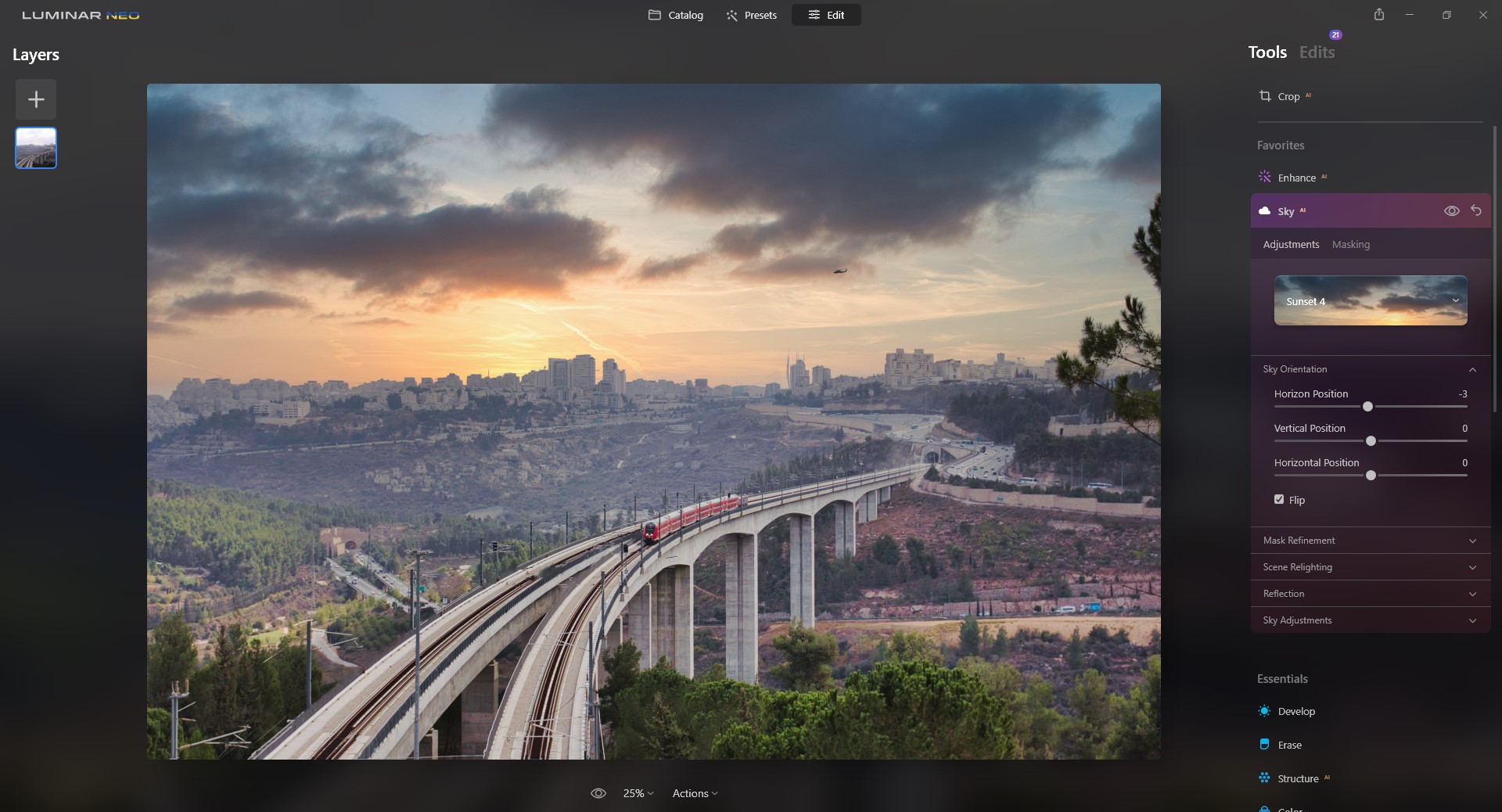התוכנה Luminar Neo פשוטה וקלה לעבודה, ומבוססת ברובה על בינה מלאכותית. [וכמו שכתבתי הרבה מהתכונות קימות ברמה כזאת או אחרת בפוטושופ/לייטרום.]