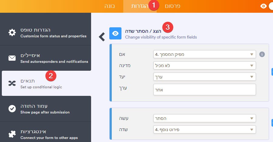 נבחר בתפריט-הצד "תנאים", ואז "הצג / הסתר שדה".