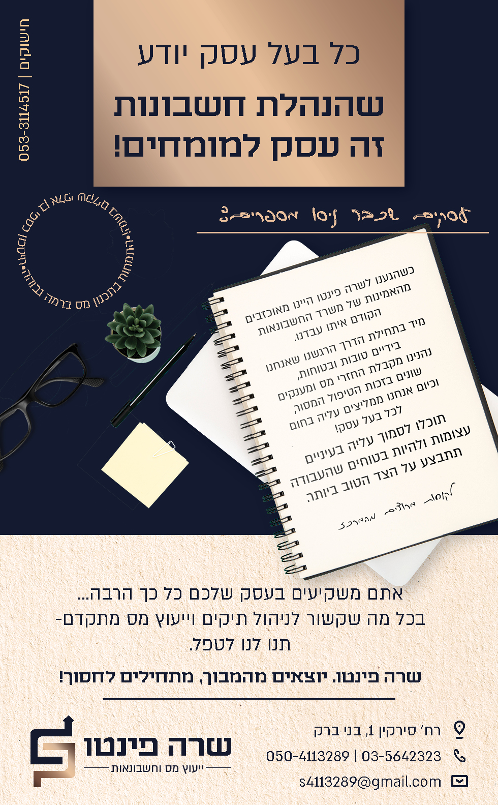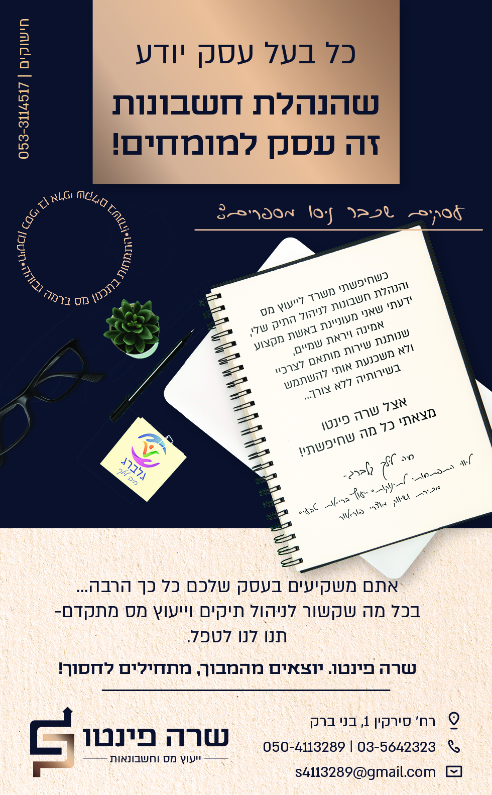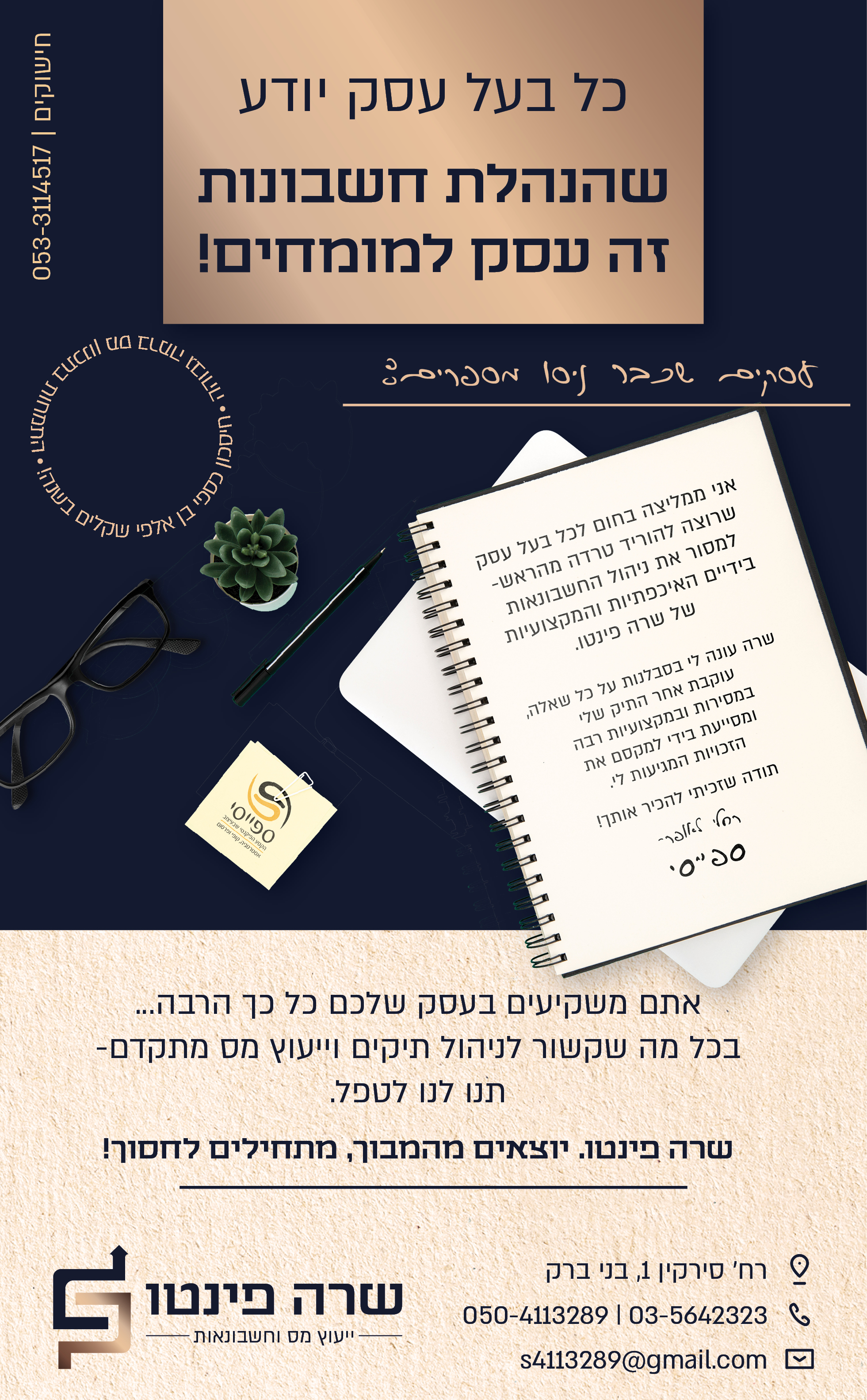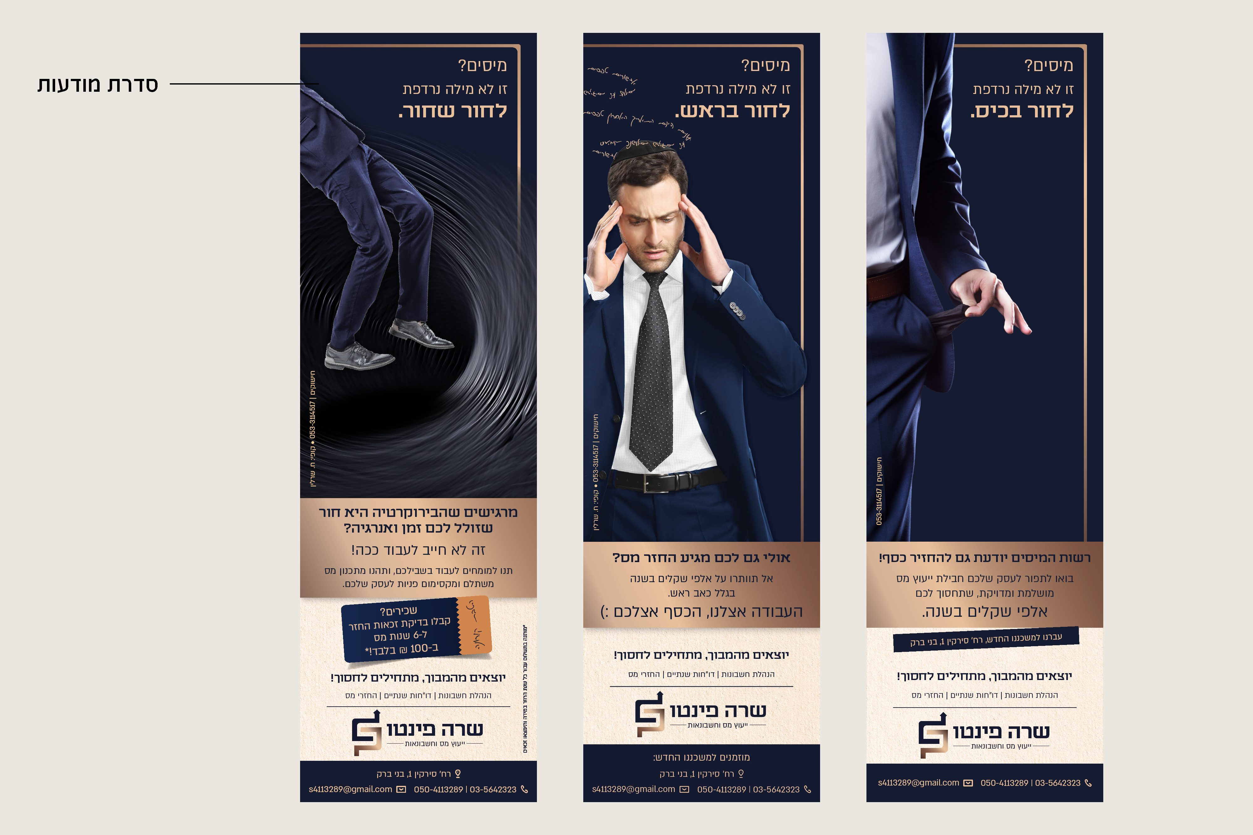 אז הנושאים כבר רשומים לי במסמך התכנון כזכור, ובמודעה הנוכחית אני בוחרת להביא לפרונט את הערך של הארגון, ההקלה, והעול שיורד מגב הלקוחות בזכות השירות המושלם של שרה. מיסים זו מילה נרדפת למבוך מבלבל ומתיש? לא אצל הלקוחות שלנו.