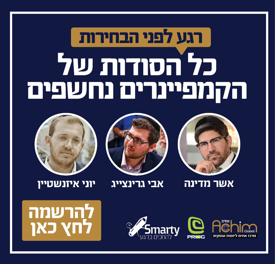 את הפאנל ינחה מנהל מגמת פרסום במכללת פרוג הפרסומאי והמרצה מנדי פרומר, וישתתפו בו דובר מפלגת ש"ס אשר מדינה, לצידם של יועץ התקשורת אבי גרינצייג ואיש הדיגיטל יוני אייזנשטיין מיהדות התורה, שיתפנו מניהול הקמפיין האינטנסיבי ויבואו לחשוף סודות מאחורי הקלעים של הפרסום הפוליטי.