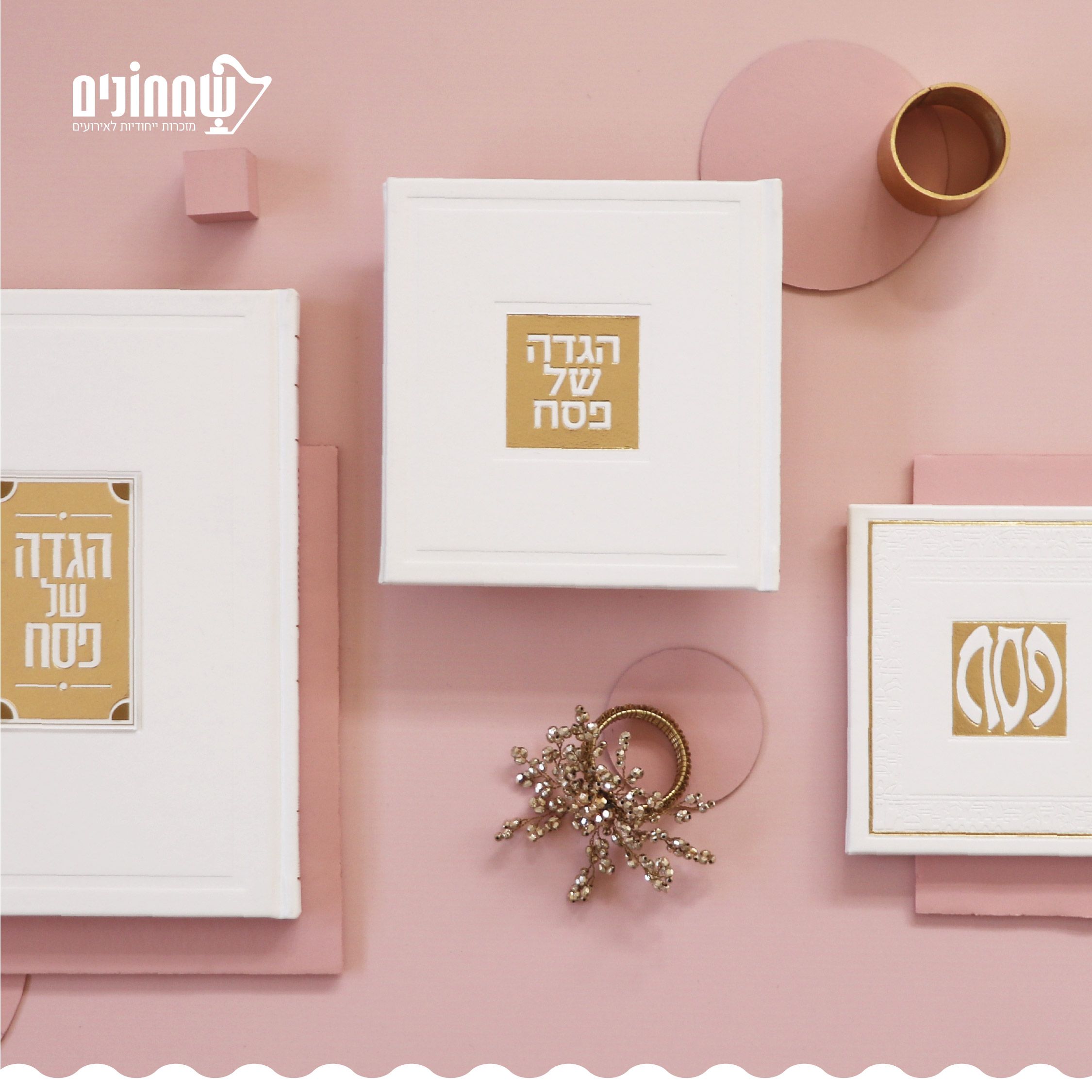 הגדות לפסח: מבחר הגדות בעלות גימור מוקפד בגדלים שונים, המכילות אותיות מאירות עיניים, שוליים מוזהבים ונייר איכותי. ההגדות כרוכות בכריכת עור משובחת, או כריכת דמוית עור המשדרת יוקרה וטוב טעם.