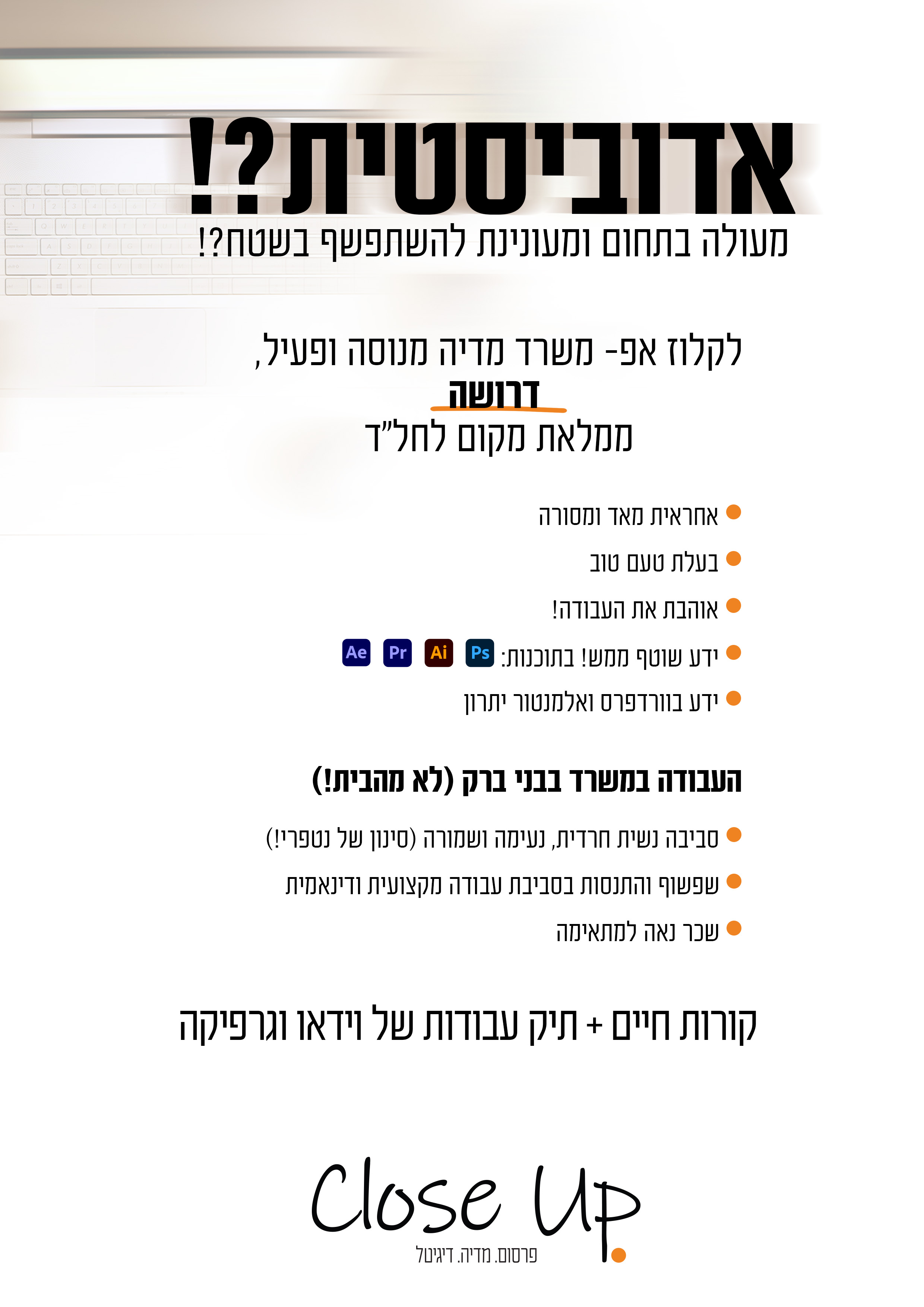 יש לשלוח קורות חיים+ תיק עבודות של וידאו+גרפיקה