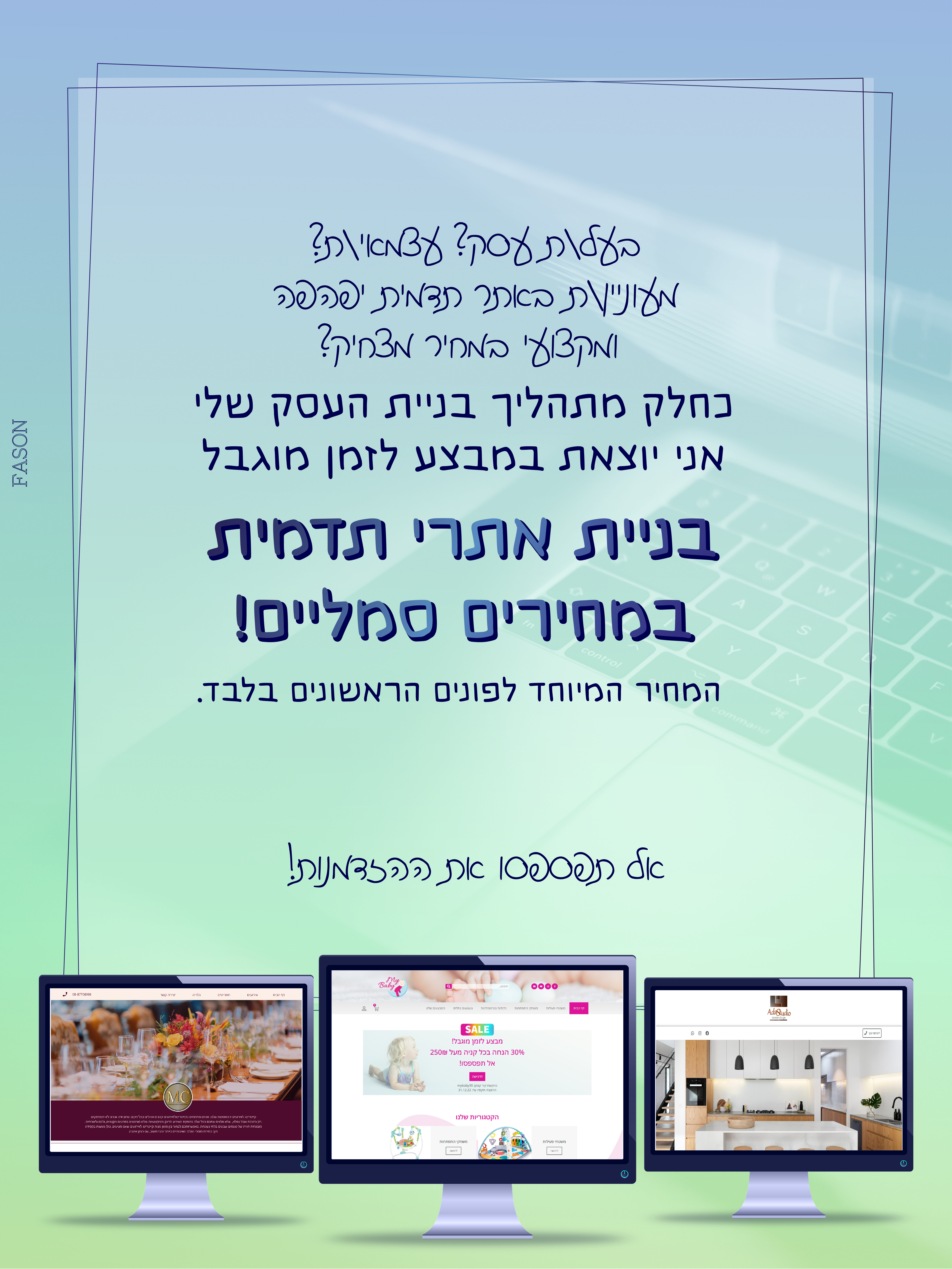 מעוניינים באתר תדמית/אתר מכירות במחיר מצחיק? הזדמנות שלא תחזור לאתר מקצועי, רספונסיבי ומהיר, בעיצוב אישי וייחודי. צרו קשר לפרטים:)