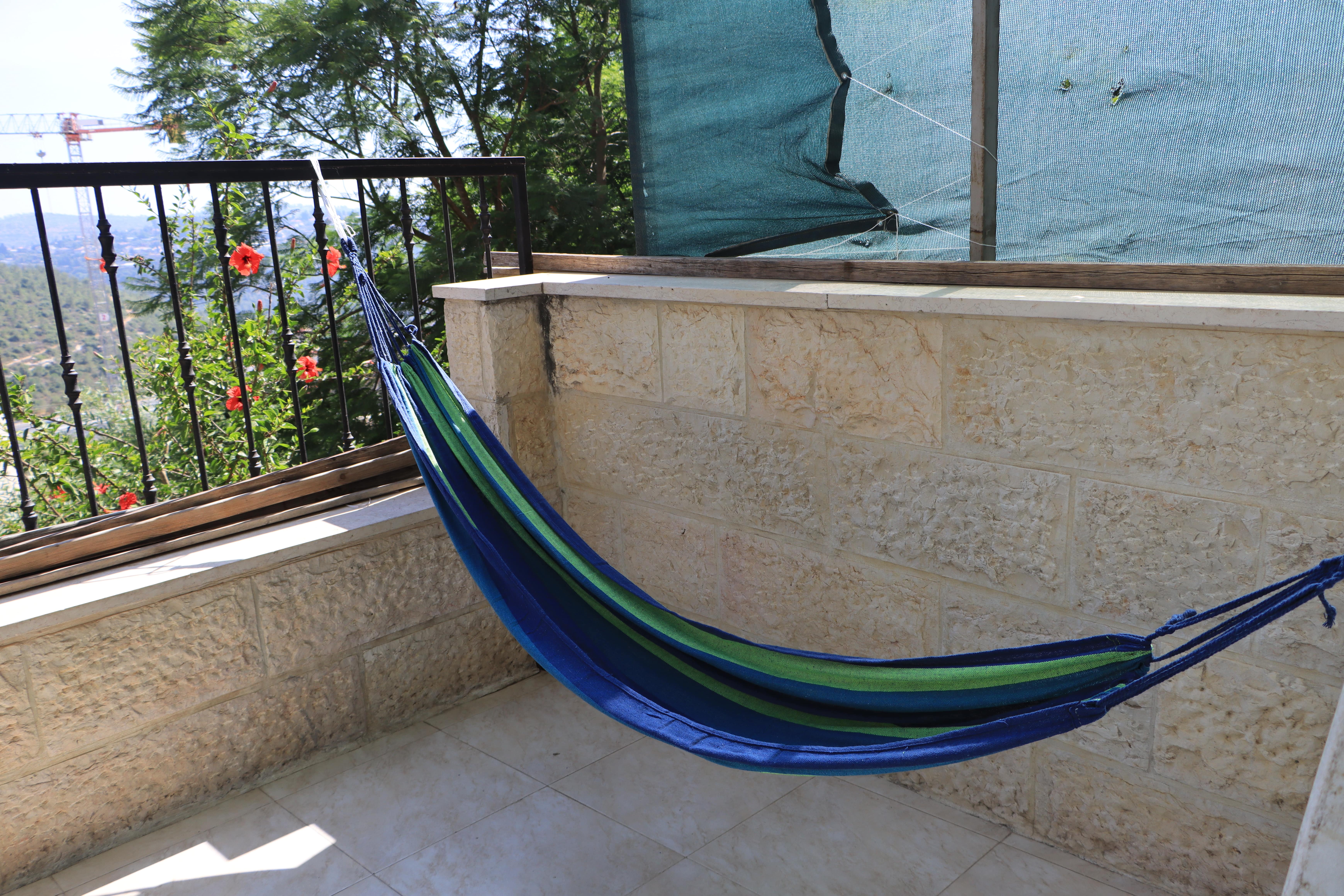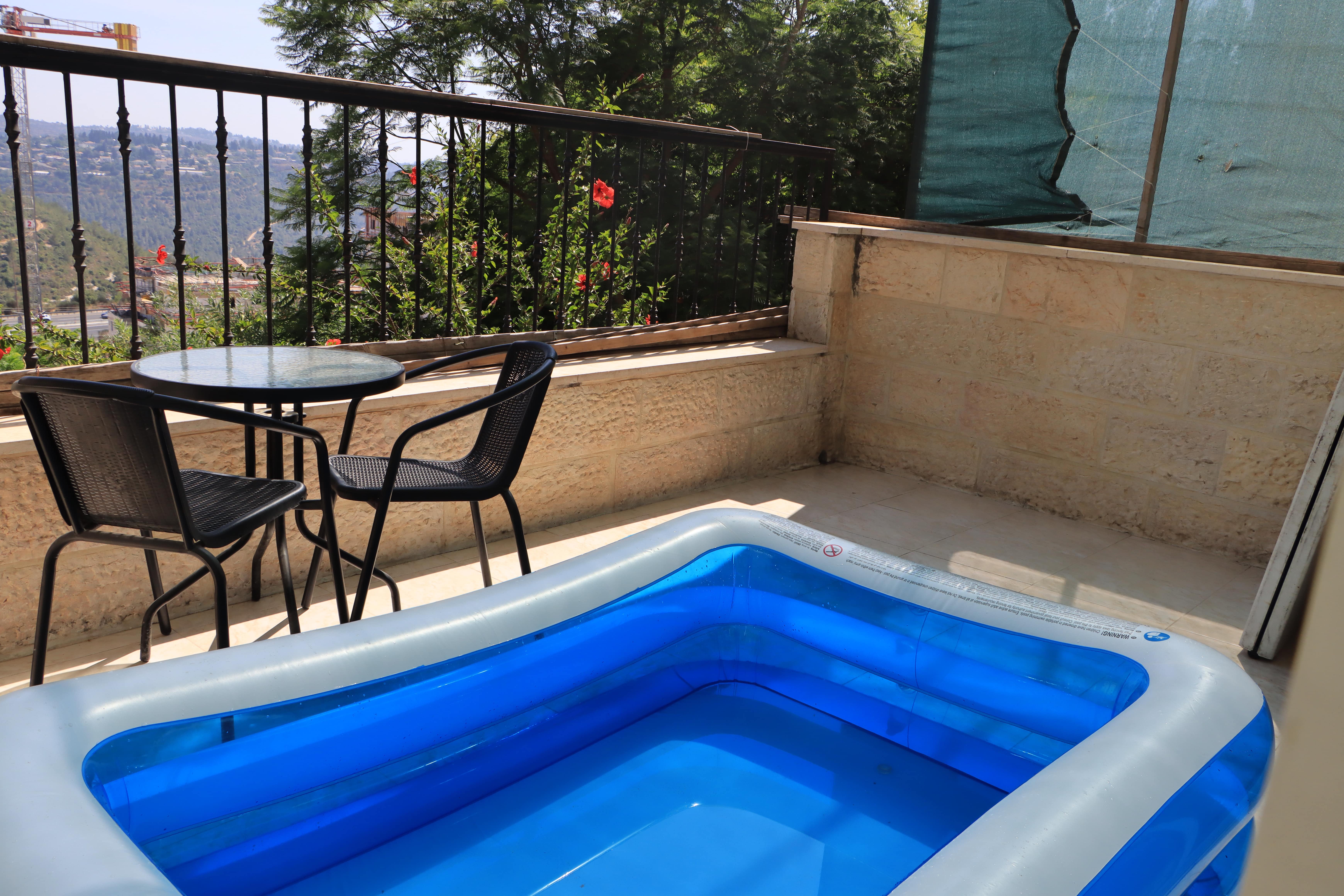 בדירה יש מרפסת גדולה ומוצלת עם נוף מהמם, בריכה גדולה לילדים וערסל.