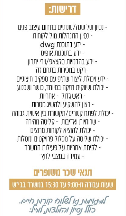 - ניסיון של שנה/שנתיים בתחום עיצוב פנים