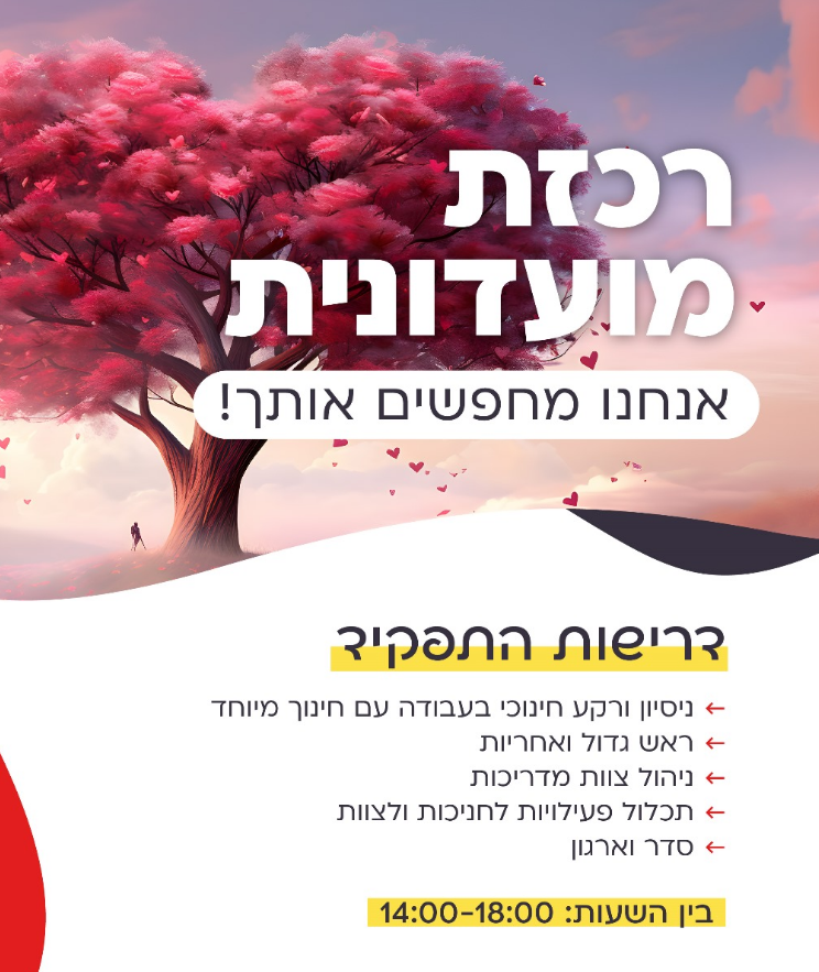 • ניהול שוטף של המועדונית, כולל הכנת פעילויות, השגחה על הילדים וטיפול בצרכים שלהם.