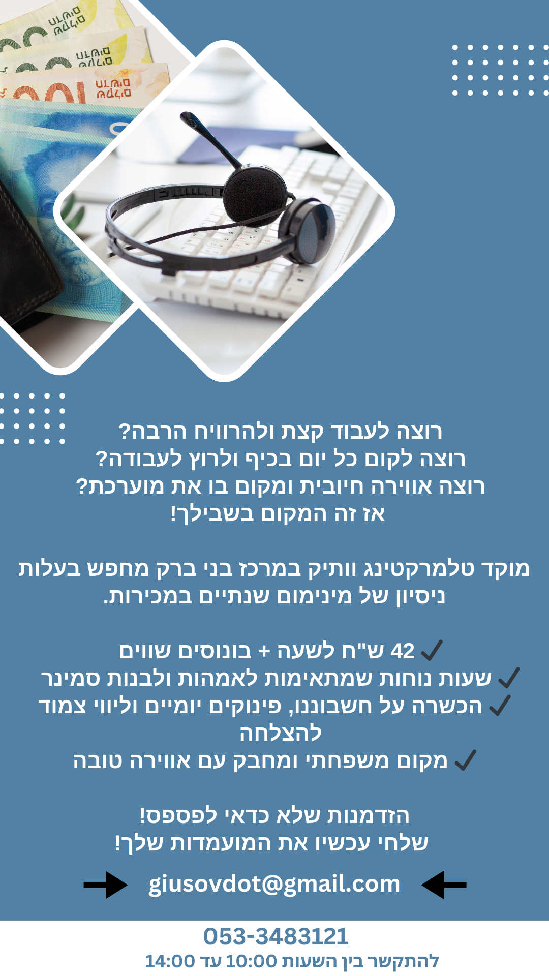 שלחי קורות חיים עכשיו והצטרפי לצוות שלנו - giusovdot@gmail.com