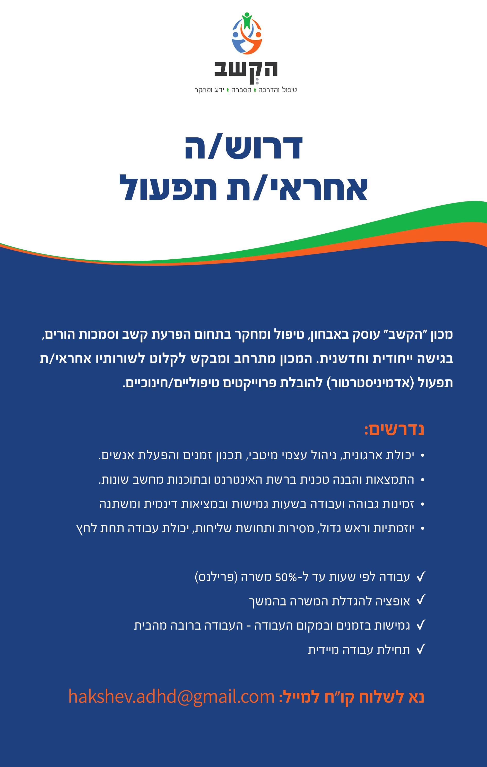 המכון מתרחב ומבקש לקלוט לשורותיו אחראי/ת תפעול (אדמיניסטרטור) להובלת פרוייקטים טיפוליים/חינוכיים.
