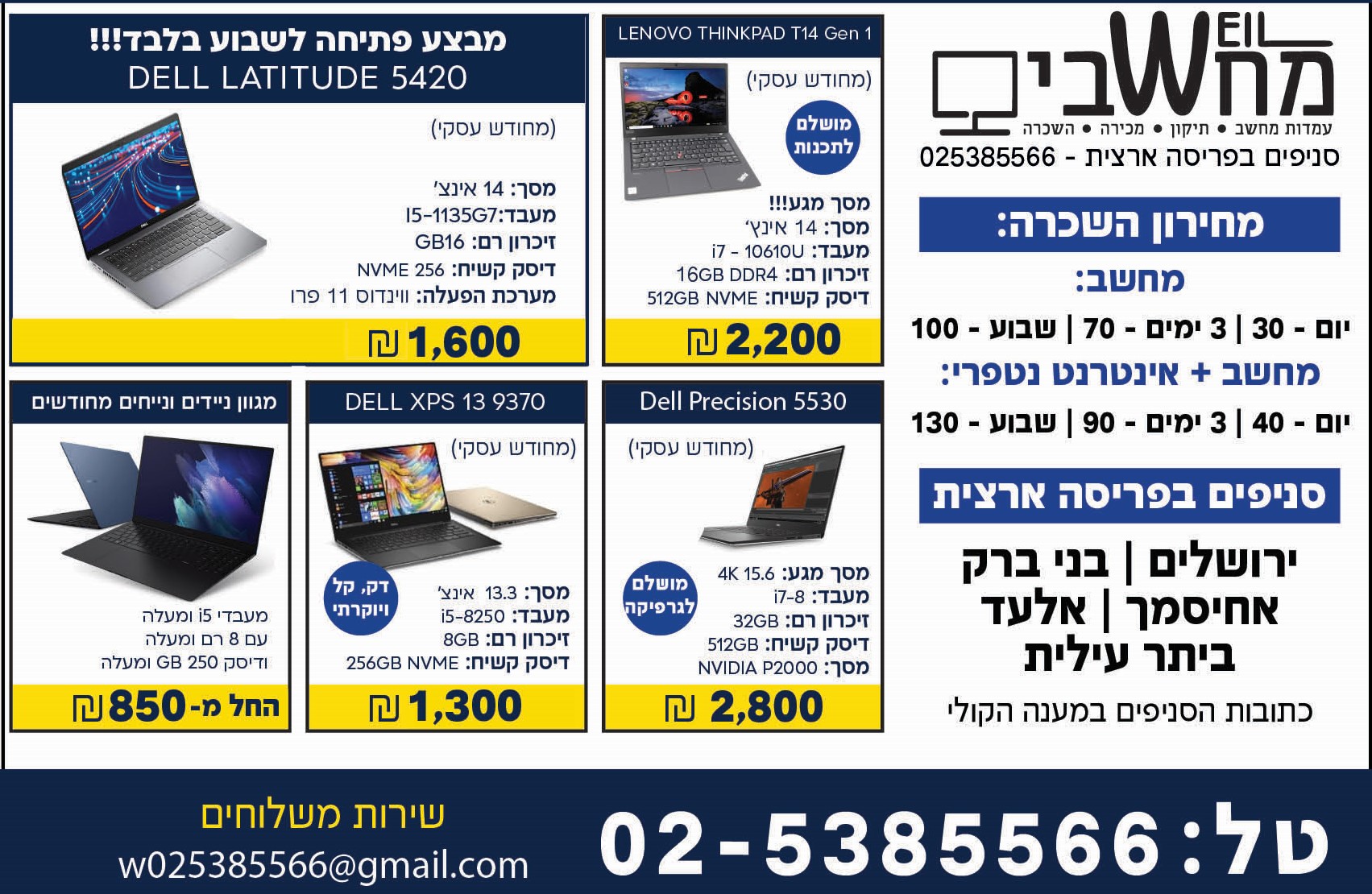 השכרת ומכירת מחשבים בירושלים בני ברק ואחיסמך אלעד וביתר !
