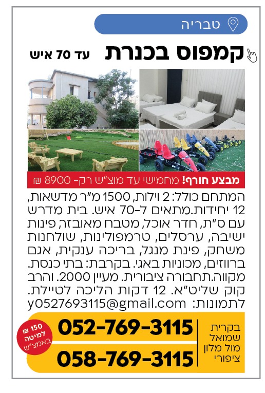 התפנה מקום לשבת הקרובה-קמפוס בכנרת עד 70 איש מחמישי עד מוצ"ש • במחיר מיוחד של הדקה ה90