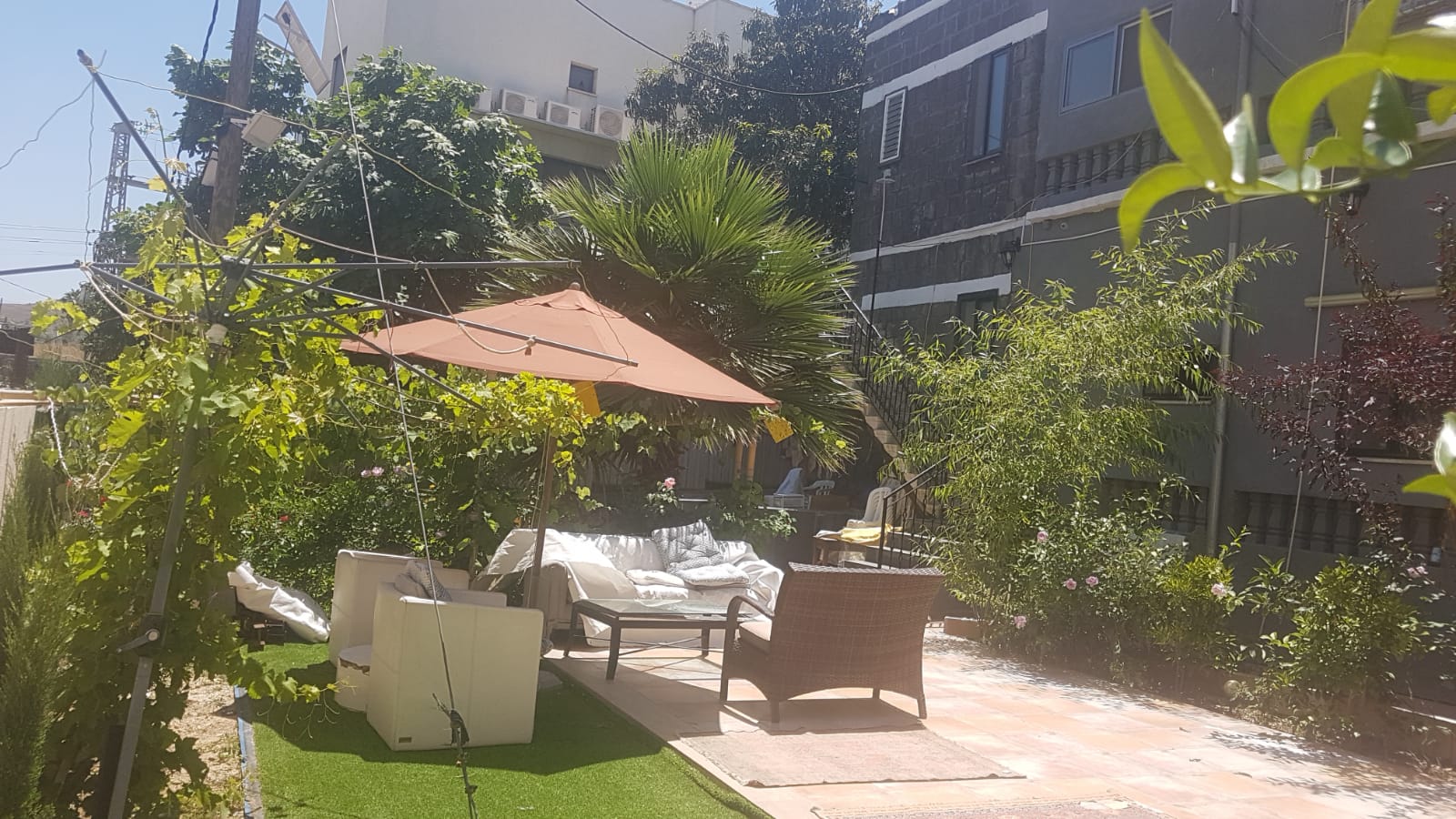 2 קומות +חצר ענקית הכוללת גינה עם מקומות ישיבה . מרוהטת ומאובזרת וממוזגת .