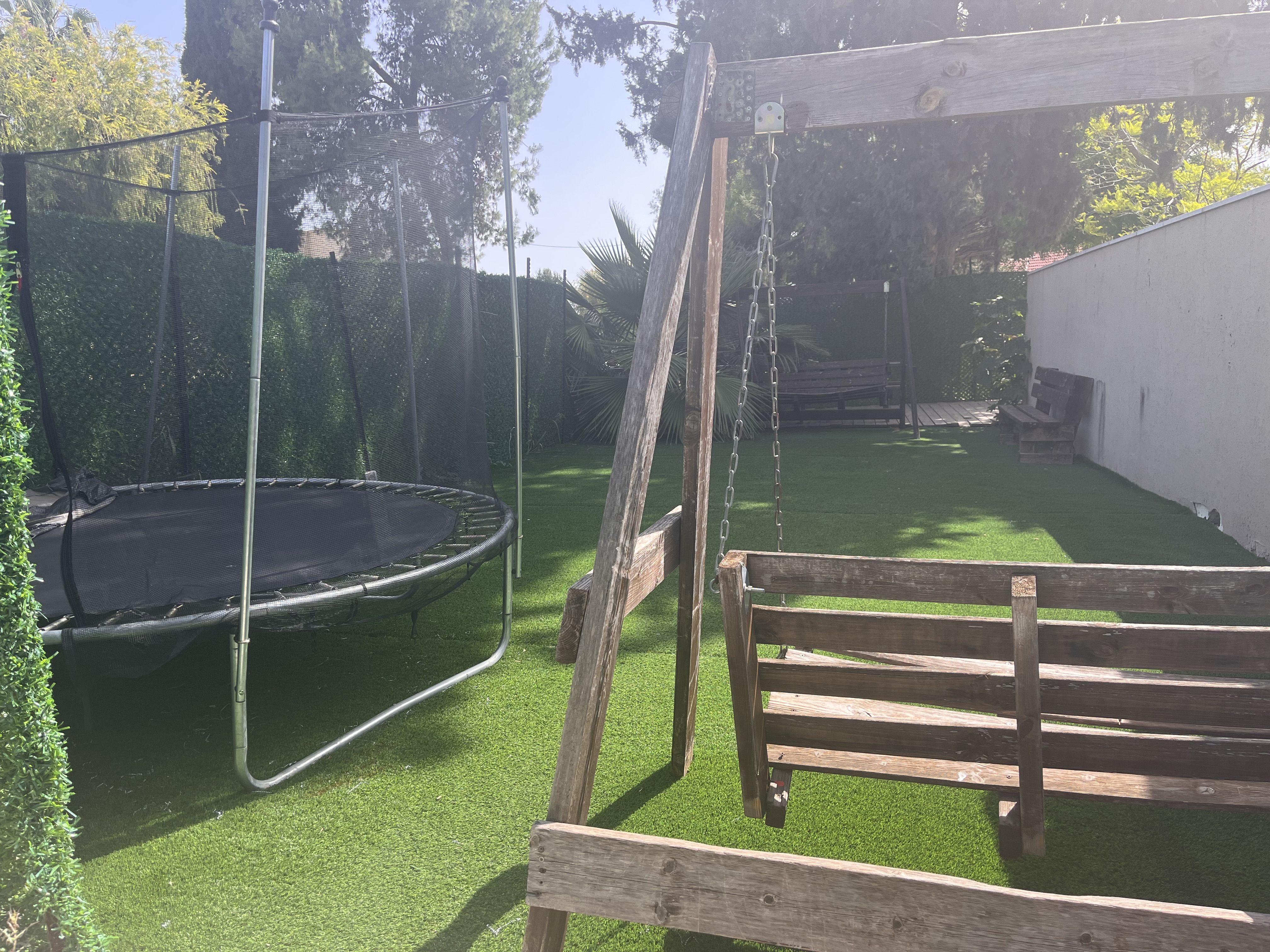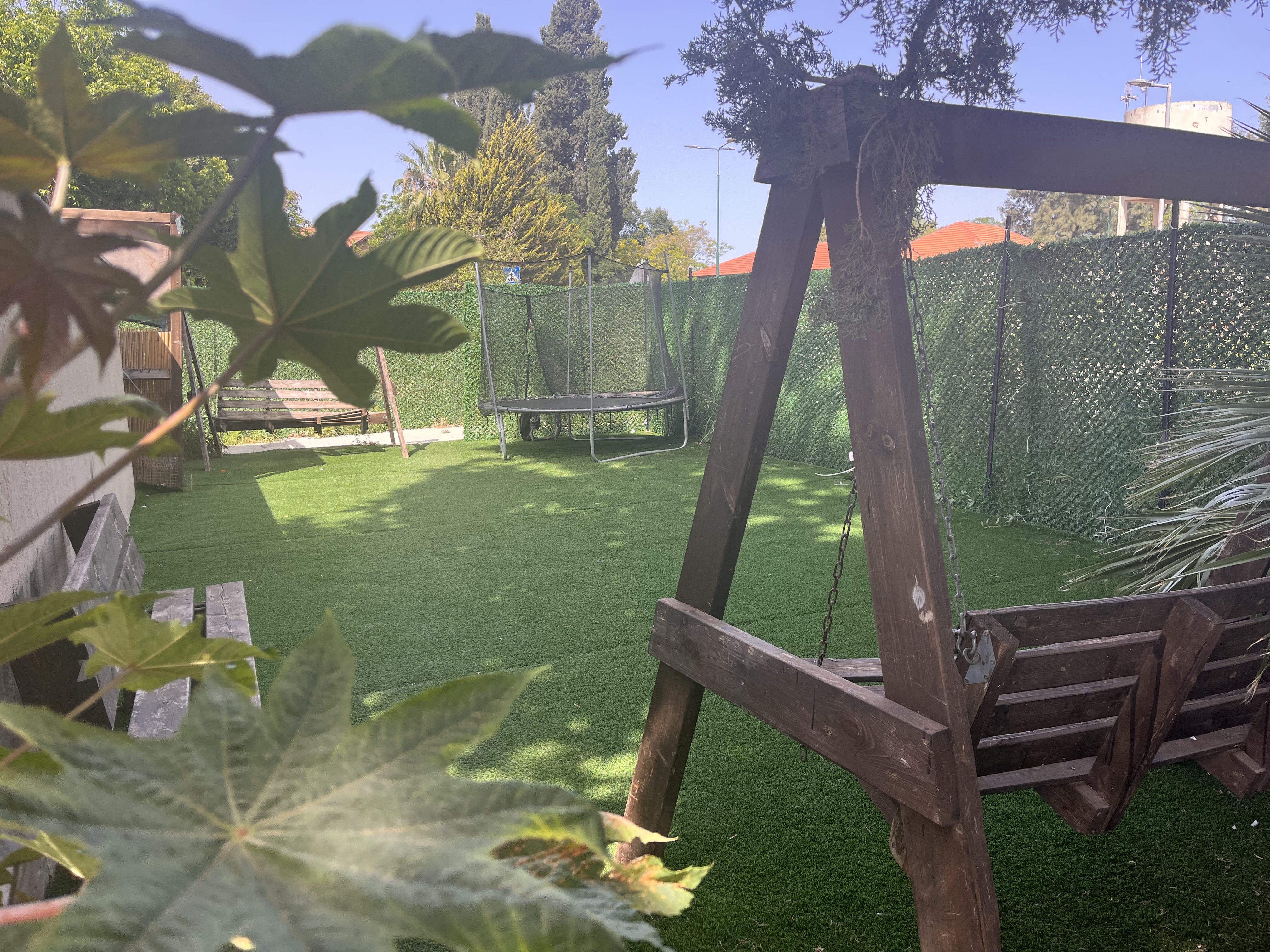 דשא, נדנדות, ספסלים וטרמפולינות.