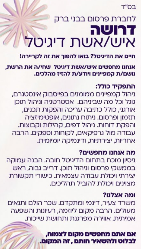 אנחנו מחפשים איש/אשת דיגיטל חרוץ/ה ומנוסה, שחי/ה את הרשת, נושם/ת קמפיינים ויודע/ת להזיז מהלכים.
