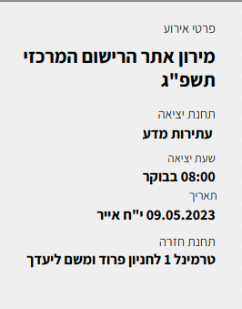 אני צריך לצאת ביום שלישי יום ל"ג בעומר י"ח אייר מירושלים מעתירות מדע בשעה 10:00 בבוקר תמורת כרטיס זהה לשעה 08:00 בבוקר או לשעה 9 בבוקר