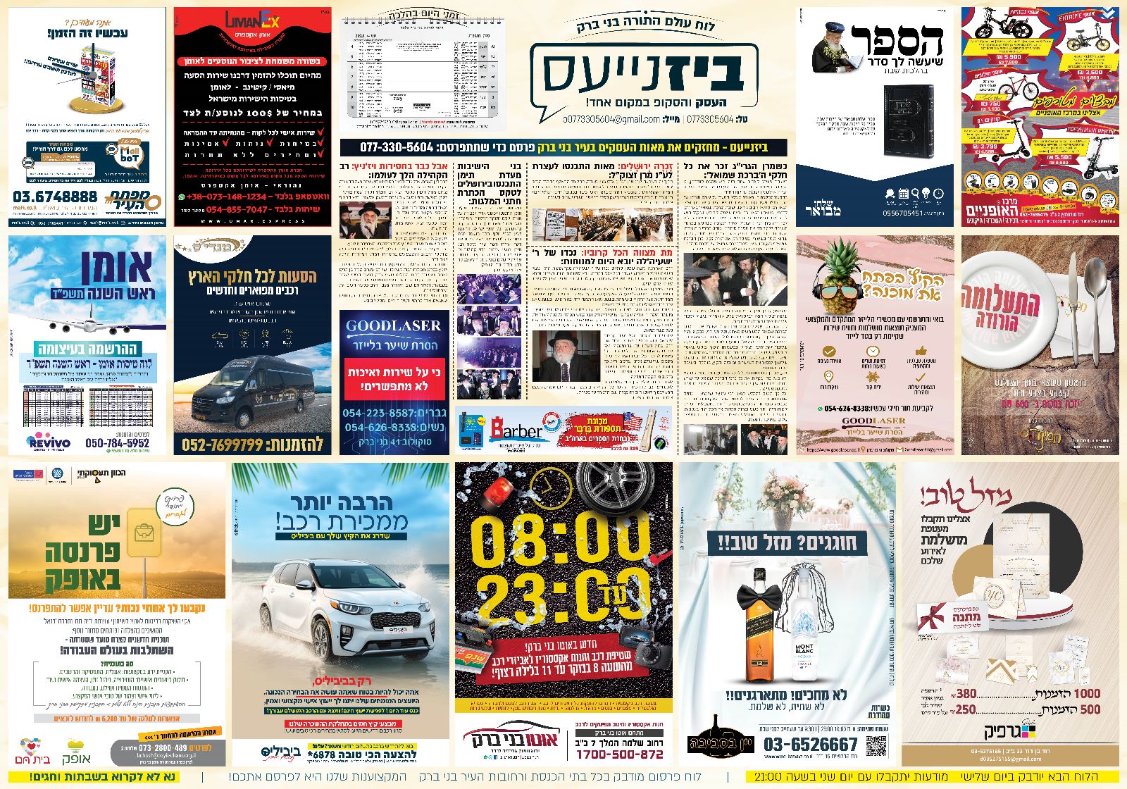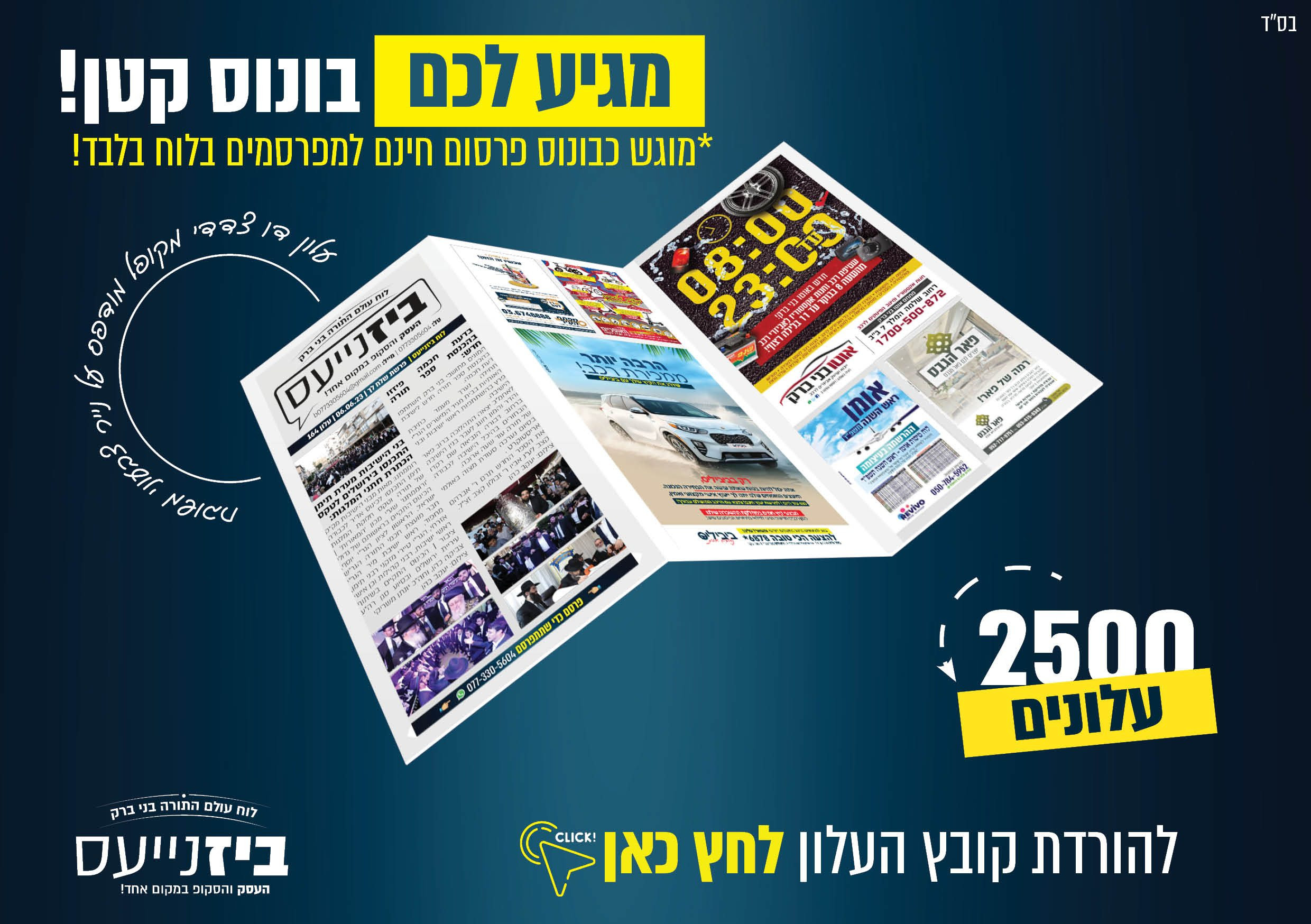 לוח ביזנייעס הינו לוח פרסום שבועי הכי מוביל המופץ בעיר בני ברק - מעל 150 נקודות - בתי כנסת, בתי מדרש, כוללים, שטיבלאך, מקוואות.