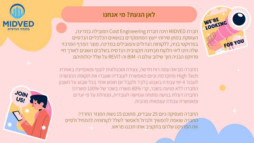 חברת מידבד כלכלה הנדסית מגייסת מנהלות פרויקטים לתפקיד מעניין ומאתגר,