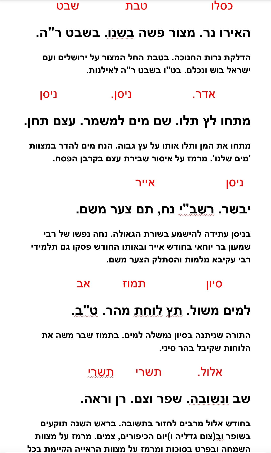 הצבע האדום אלו שמות החודשים. השחור המודגש הוא החיבור העיקרי - הפלינדרום והכתב הקטן מלמטה הוא 'פירוש' כדי לתת להיגיון להתחבר אל המילים ולכן הוא נכתב באריכות (יחסית) עם נטייה קלה להקללה וקמצוץ הומור ר"ל