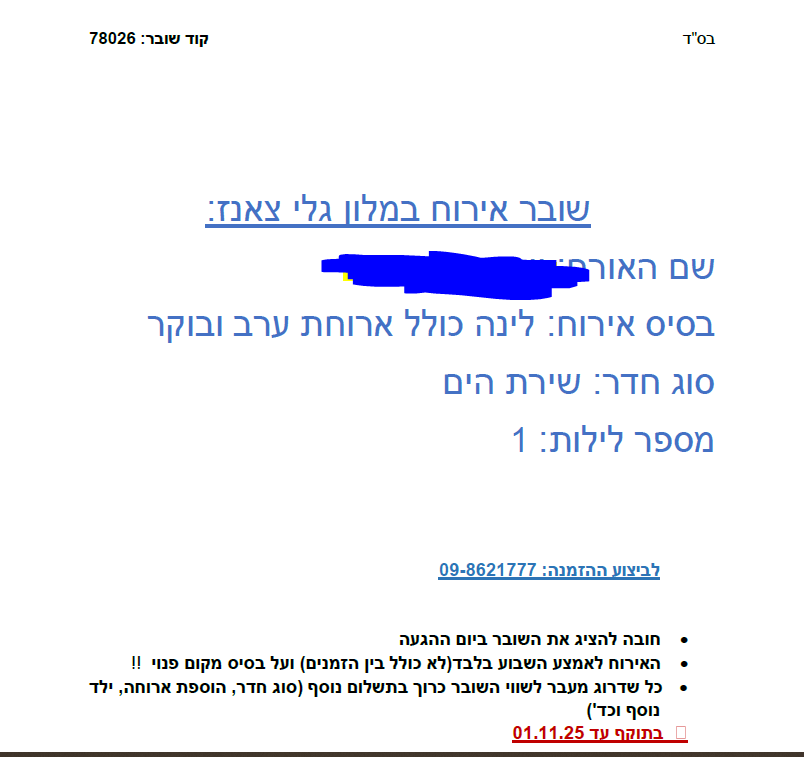 למכירה שובר ללילה באמצ"ש לזוג במלון גלי צאנז.