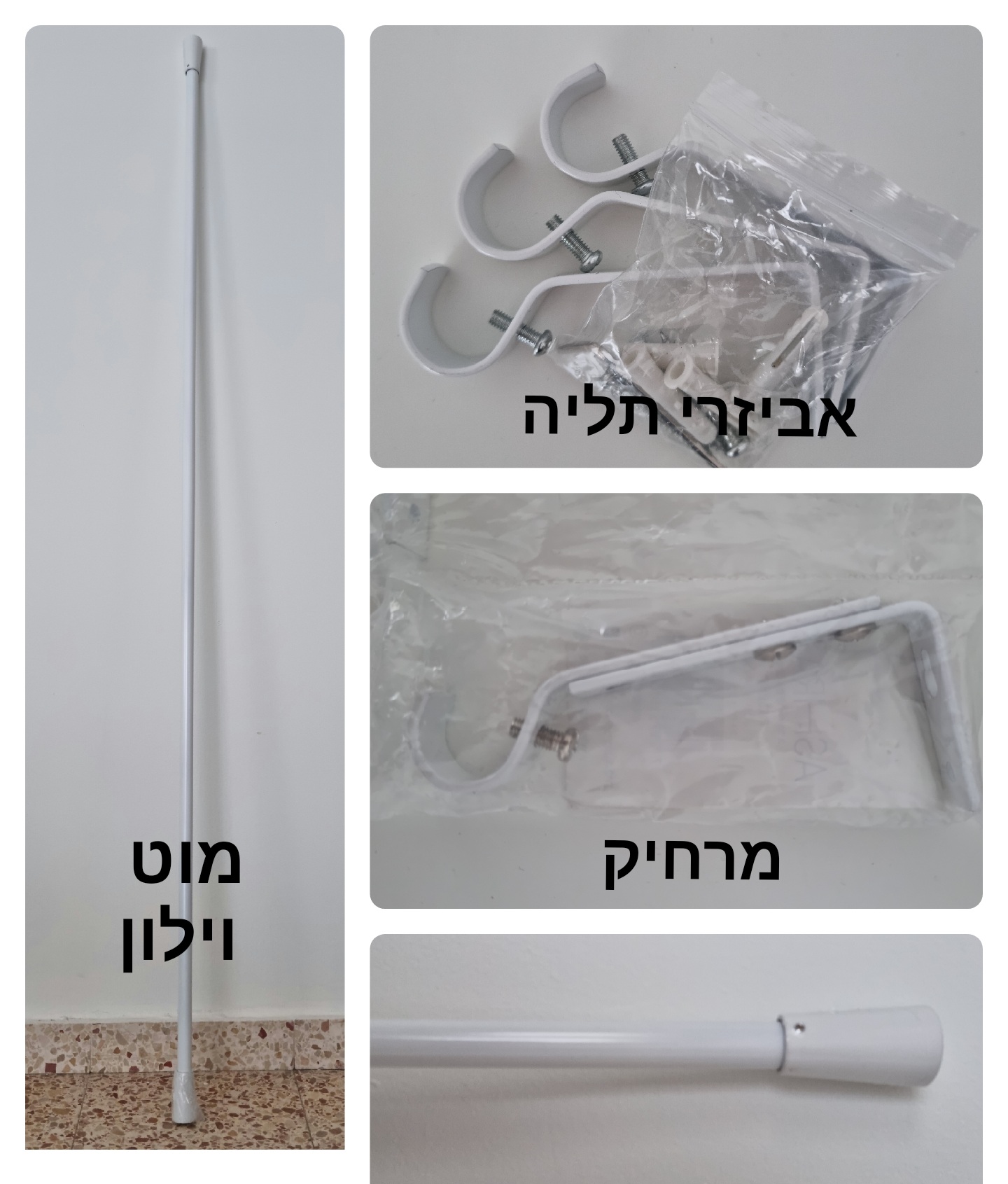 *אביזרי התליה הכלולים מרחיקים את הוילון מהקיר כ8 ס"מ ניתן לקנות מרחיק שנותן הרחקה של כ14 ס"מ מהקיר במחיר של 15 ש"ח ליחידה