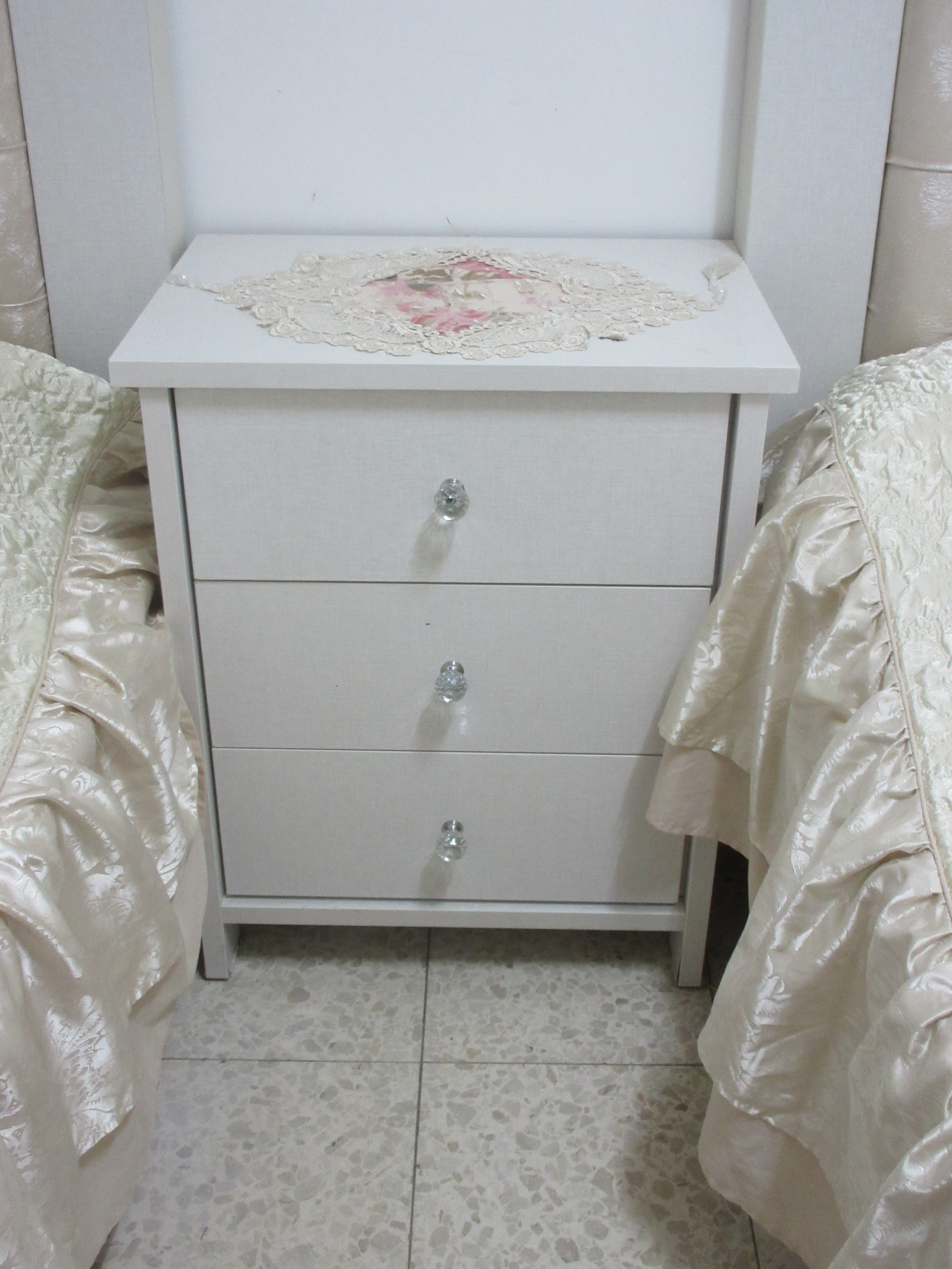 בשימוש 4 שנים נמכר עקב מעבר דירה ,כולל ארגז מצעים מצופה פורמייקה המיטות עשויות מעץ MDF ועל כן ישנם קילופים מזעריים בתחתית המיטה והשידה(3 מגירות)