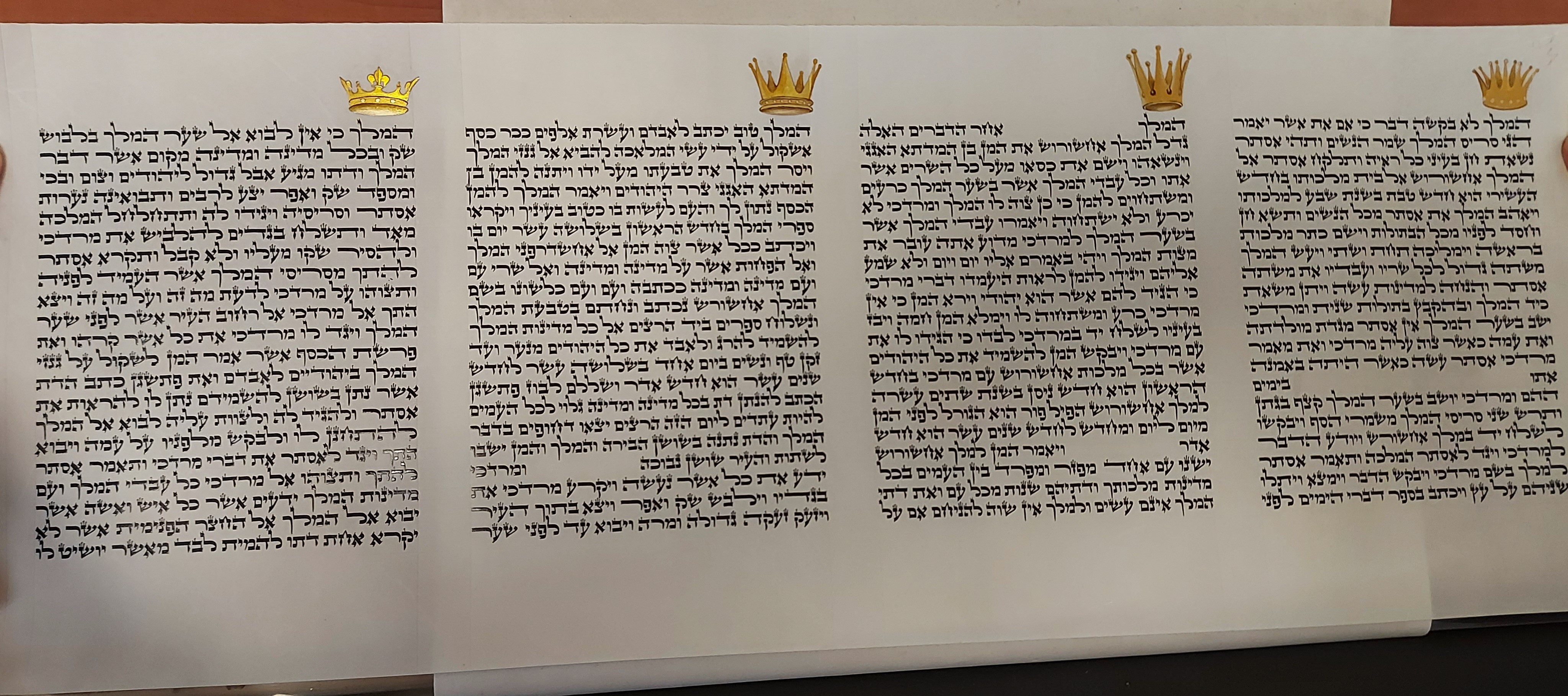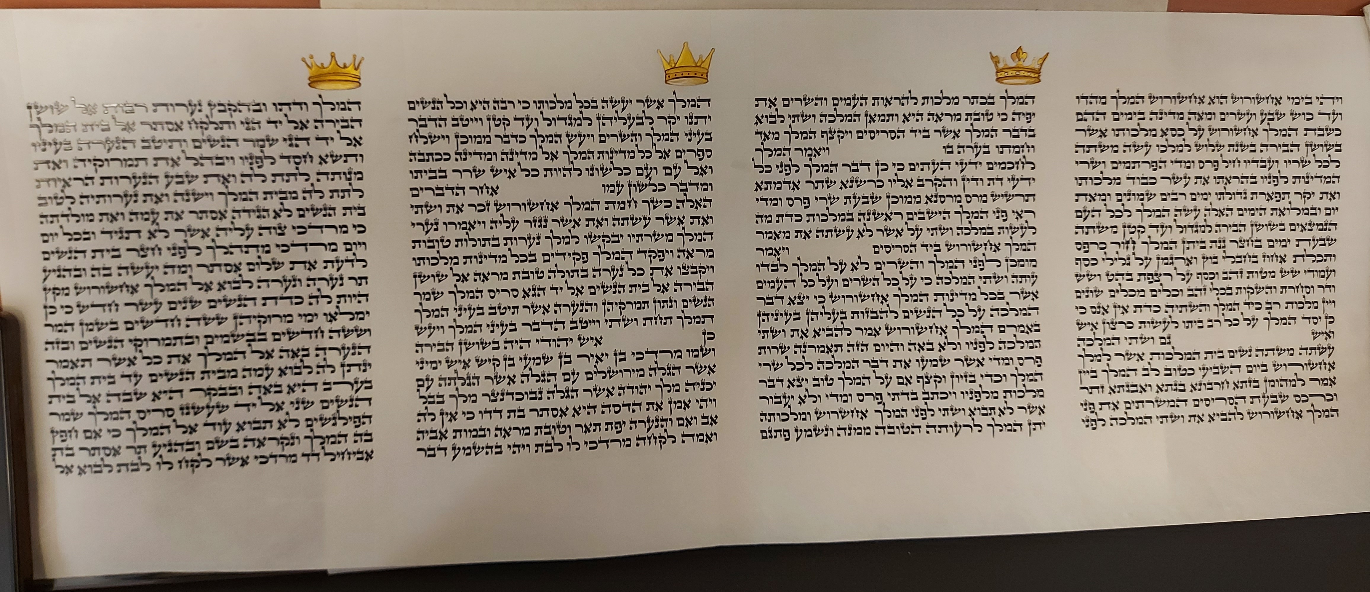 מגילת אסתר כתב בית יוסף מהודרת מאוד 21 שורות עם כתרים מאוירים בזהב