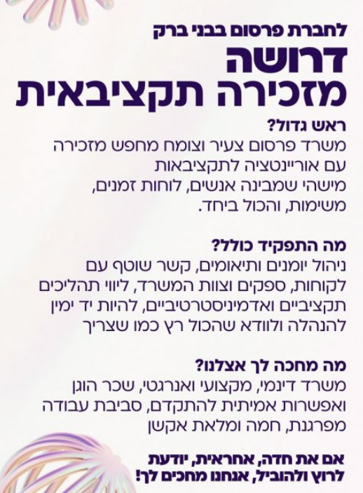 משרד פרסום צעיר וצומח מחפש מזכירה עם אוריינטציה לתקציבאות