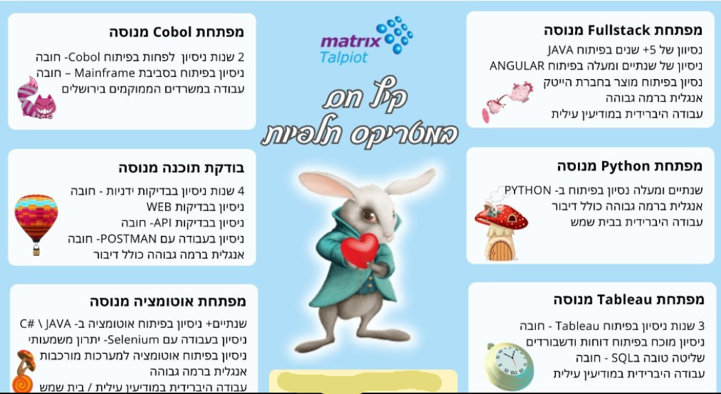 מטריקס תלפיות מגייסת למגוון משרות מעניינות ומאתגרות , בתנאים מעולים בסביבה נשית ומכבדת במודלי עבודה היברידים!