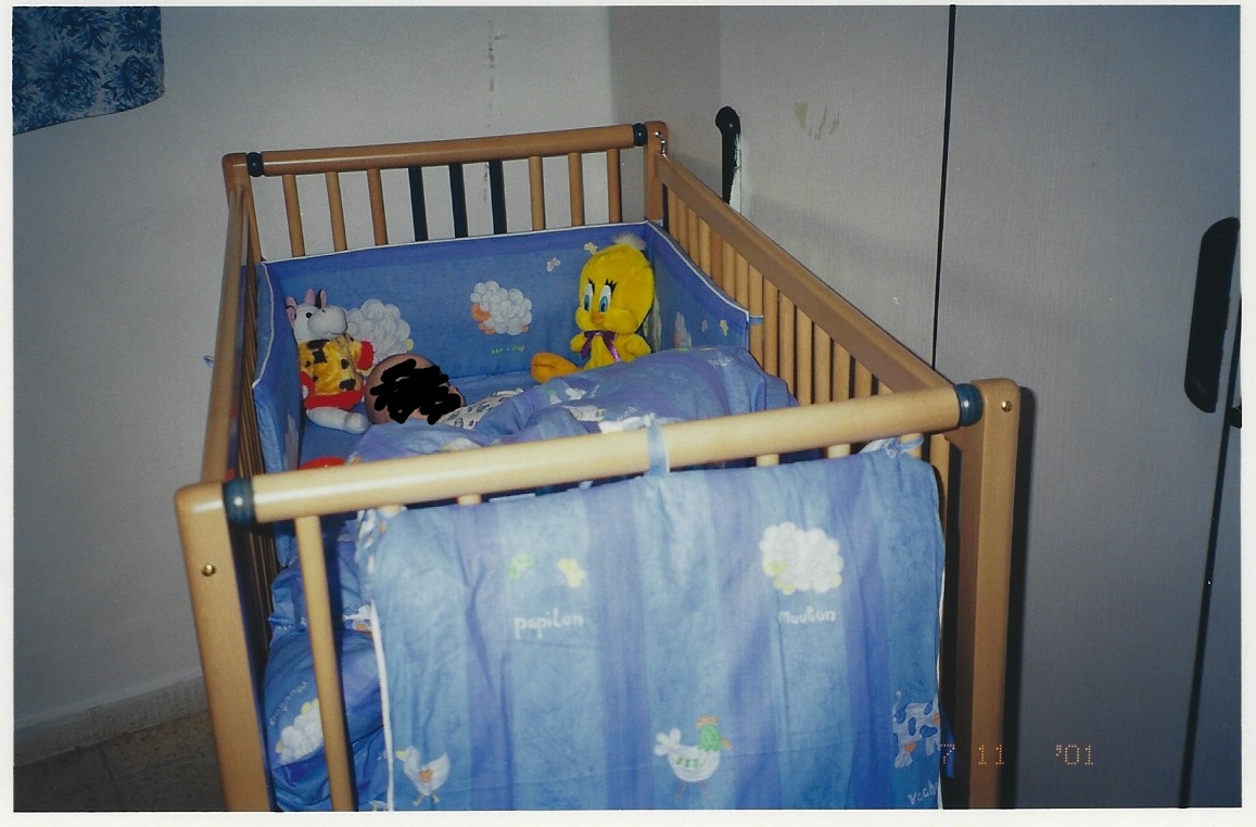 מיטת תינוק מדהימה (סגל) בצבע עץ וקישוט כחול בהזדמנות!