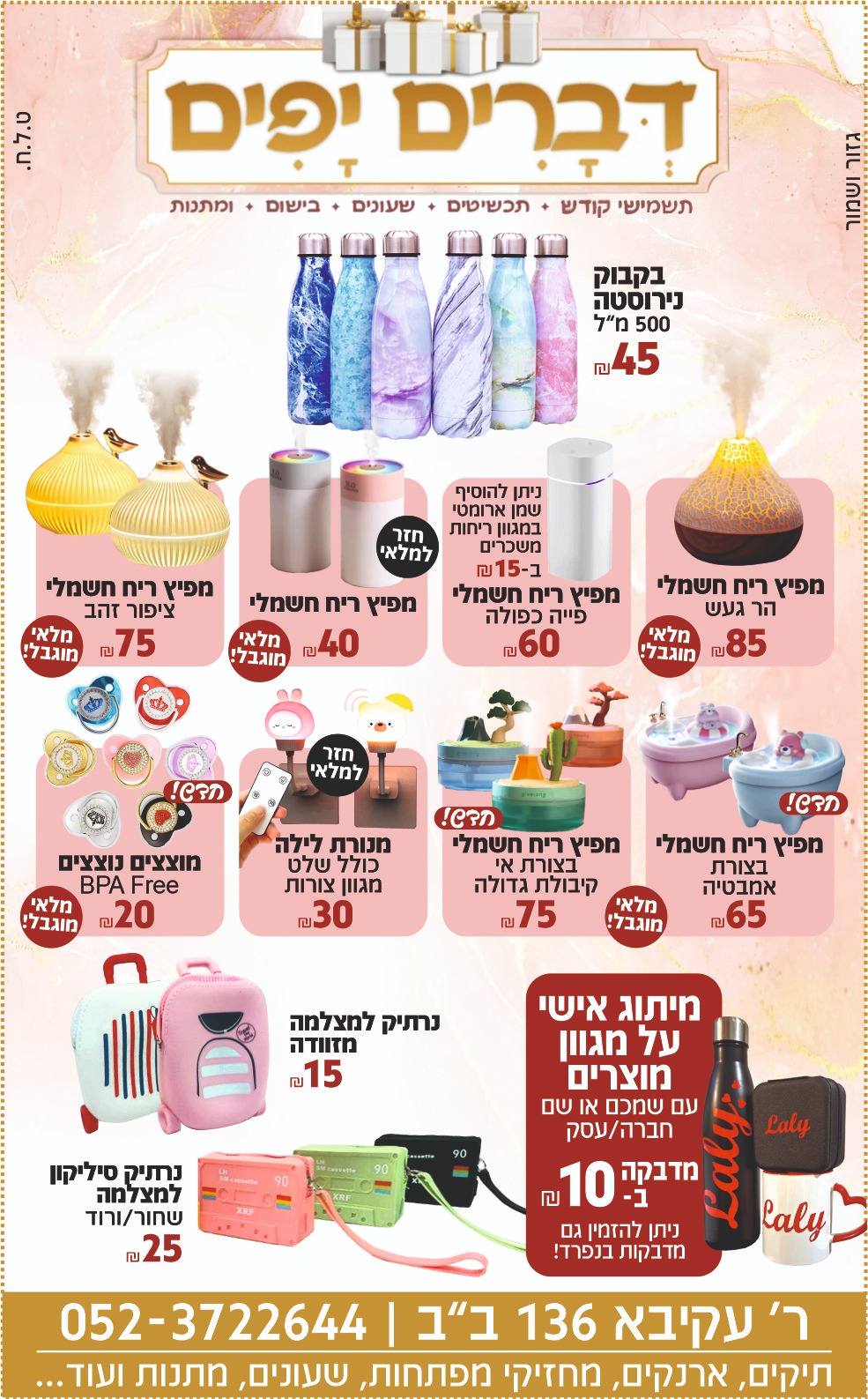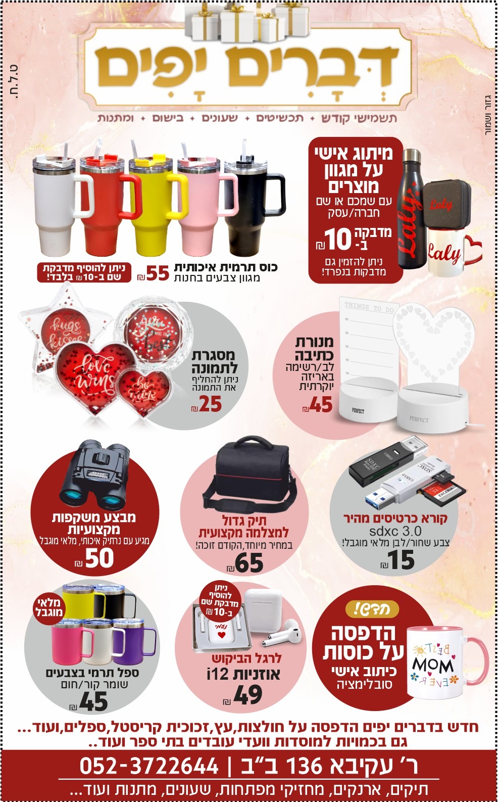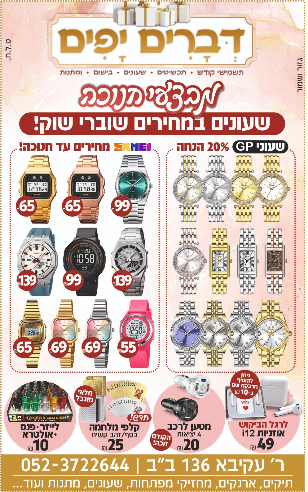 ברוכים הבאים ל"דברים יפים"אצלנו תמצאו מבחר ייחודי של מתנות, תשמישי קודש, תכשיטים, שעונים, בשמים ועוד, הכול באיכות גבוהה ובמחירים נגישים.החנות שלנו מציעה שירות אישי, מבחר מרשים, ואווירה משפחתית שמבטיחה חוויית קנייה נעימה לכל לקוח.בואו לבקר ולהתרשם – מחכים לכם.