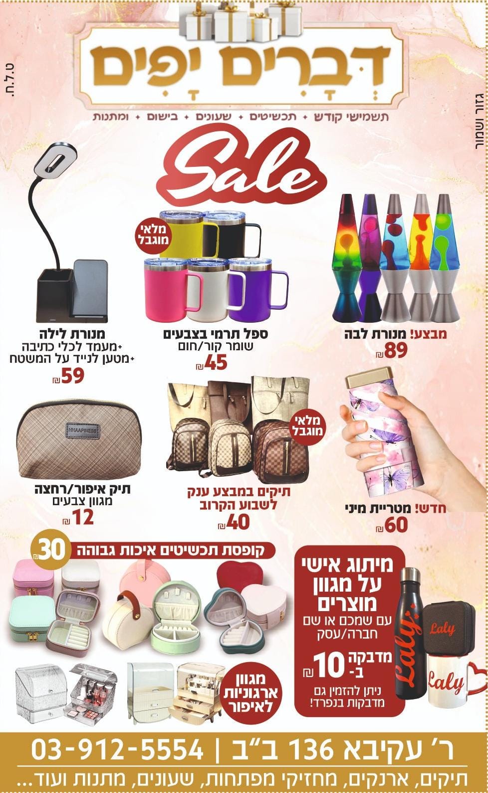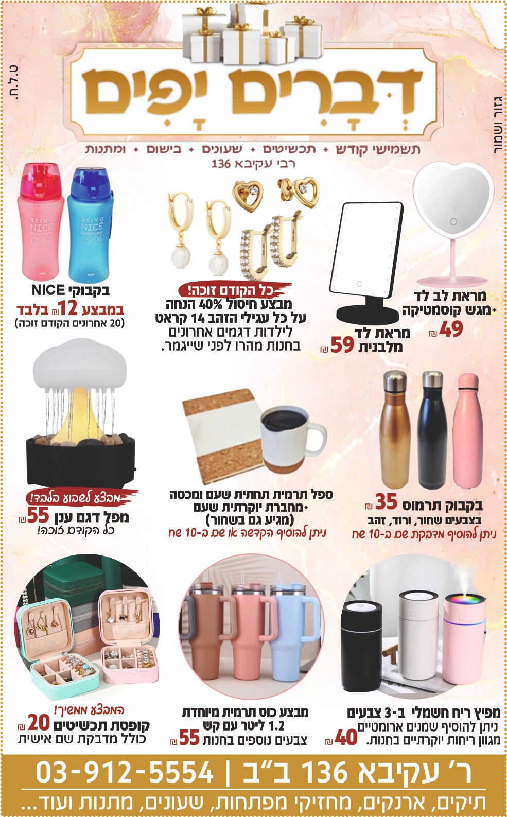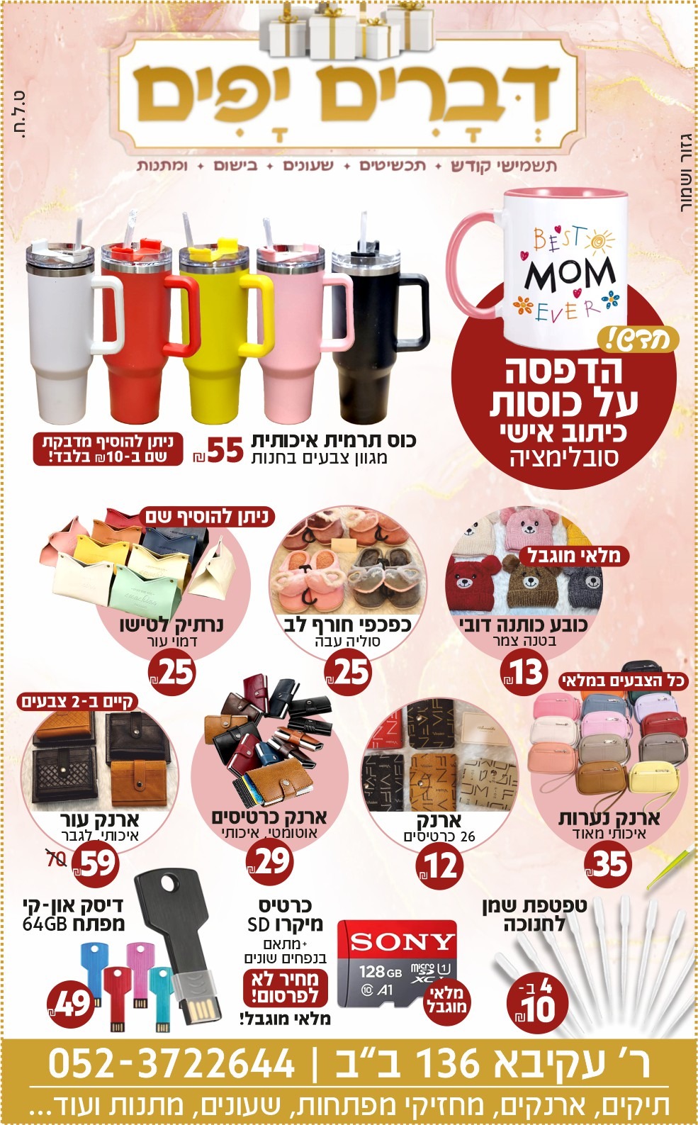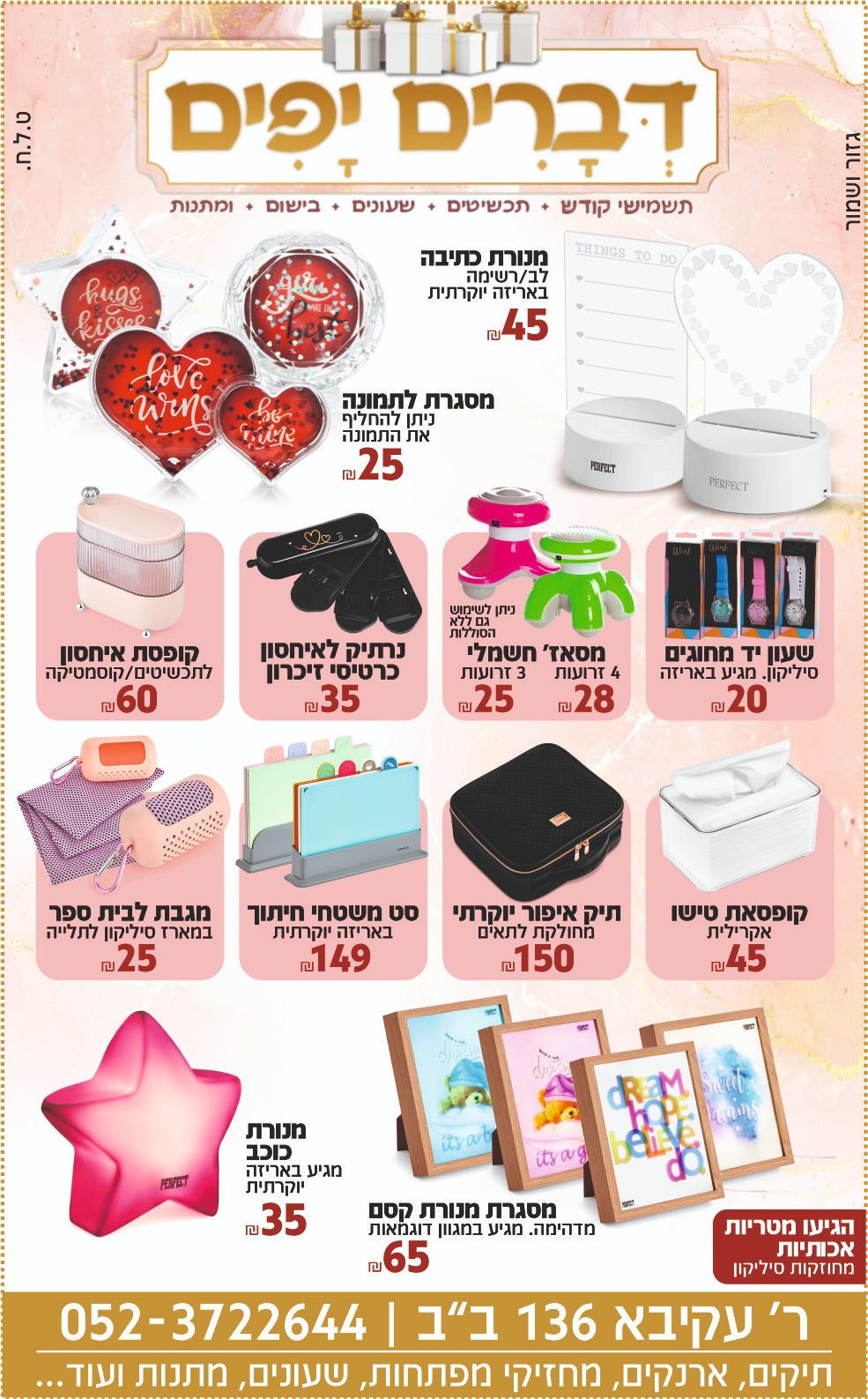 ברוכים הבאים ל"דברים יפים"אצלנו תמצאו מבחר ייחודי של מתנות, תשמישי קודש, תכשיטים, שעונים, בשמים ועוד, הכול באיכות גבוהה ובמחירים נגישים.החנות שלנו מציעה שירות אישי, מבחר מרשים, ואווירה משפחתית שמבטיחה חוויית קנייה נעימה לכל לקוח.בואו לבקר ולהתרשם – מחכים לכם.