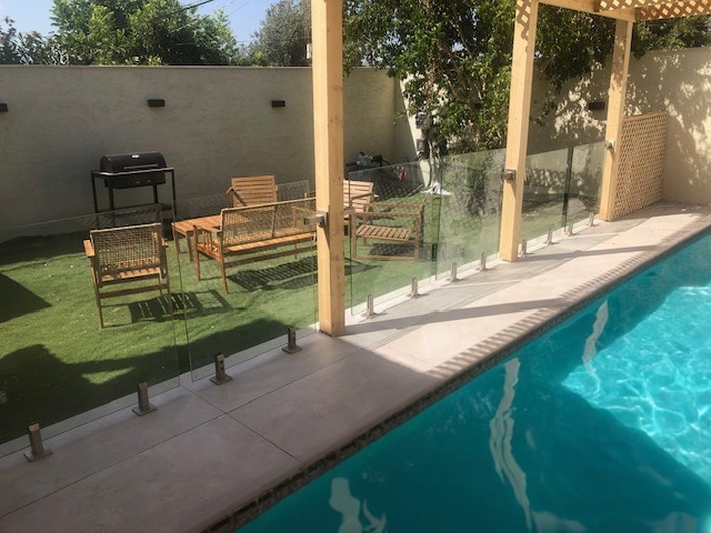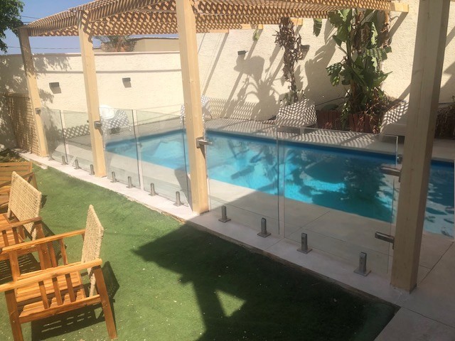 בריכה פרטית חפורה בגודל 7x3 מטרים, בעומק 1.5 מטר, עם גדר בטיחות לראש שקט.