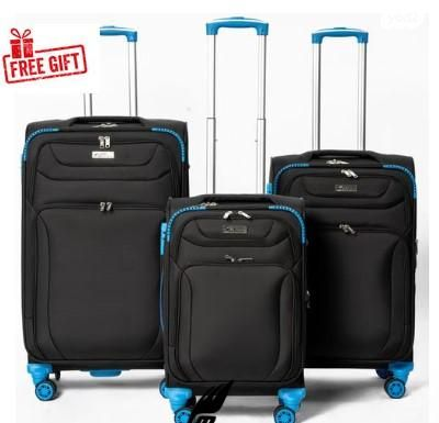 סט 3 מזוודות בד, 4 גלגלים, חדשות(עם הנליונים) שלא נעשה בהם שום שימוש, של חברת Camel Mountain בגדלים (20" + 24" + 28") צבע שחור עם גלגלים תכלת כמו בתמונה.