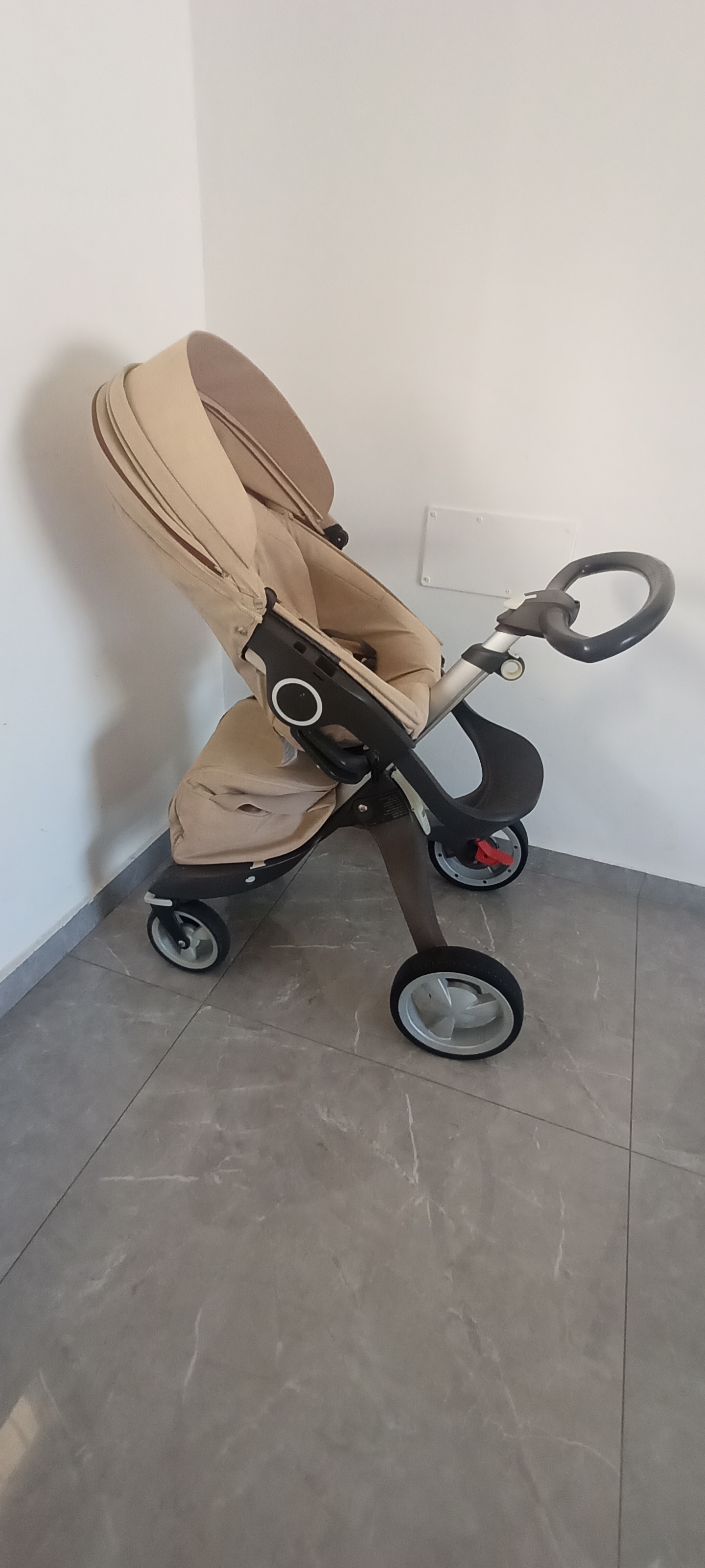 עגלת סטוקי בצבע בז' בד ג'ינס אמבטיה + טיולון במצב מצוין