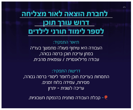 דרוש עורך תוכן לספר לימוד תורני לילדים.