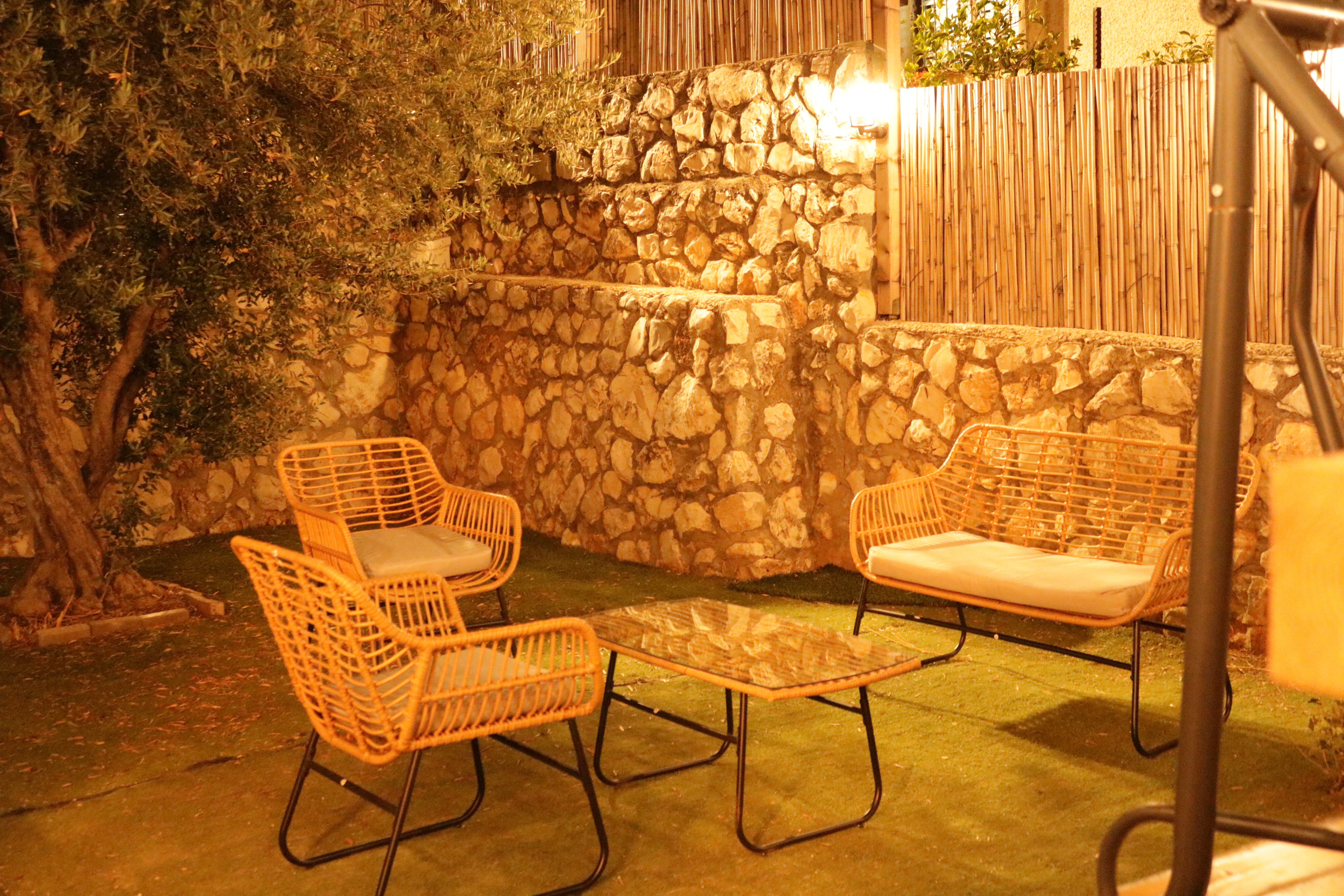 ולצידו גינה מלאת אויר ואוירה, בצל עץ הזית.