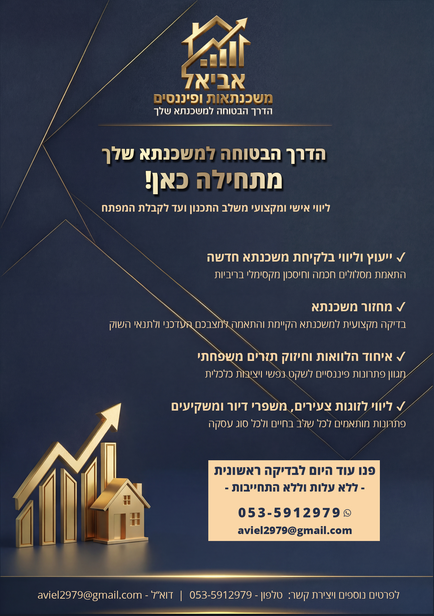 אני אביאל, יועץ משכנתאות ופיננסים - מזמין אתכם לשיחה אישית, שבה נבנה יחד את המסלול הבטוח והחסכוני ביותר בשבילכם.