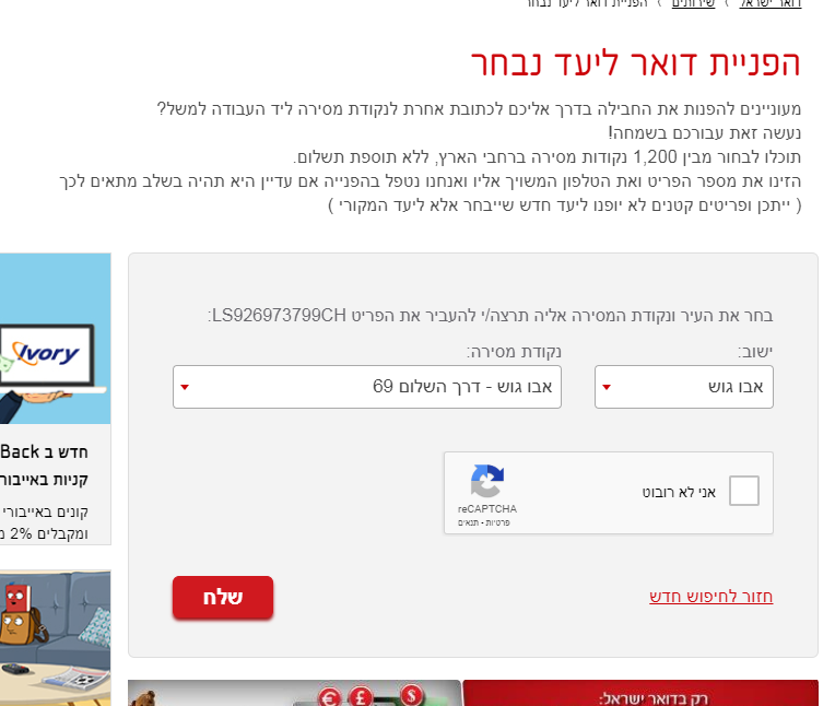 קיבלתי היום מייל מהדואר כי ישנה חבילה בדרך אלי, ובאם אני רוצה לשנות את יעד המסירה בהתאם לרצוני (סניף דואר\מרכז מסירה) אני יכולה לבצע זאת דרך הלינק כאן: לינק.